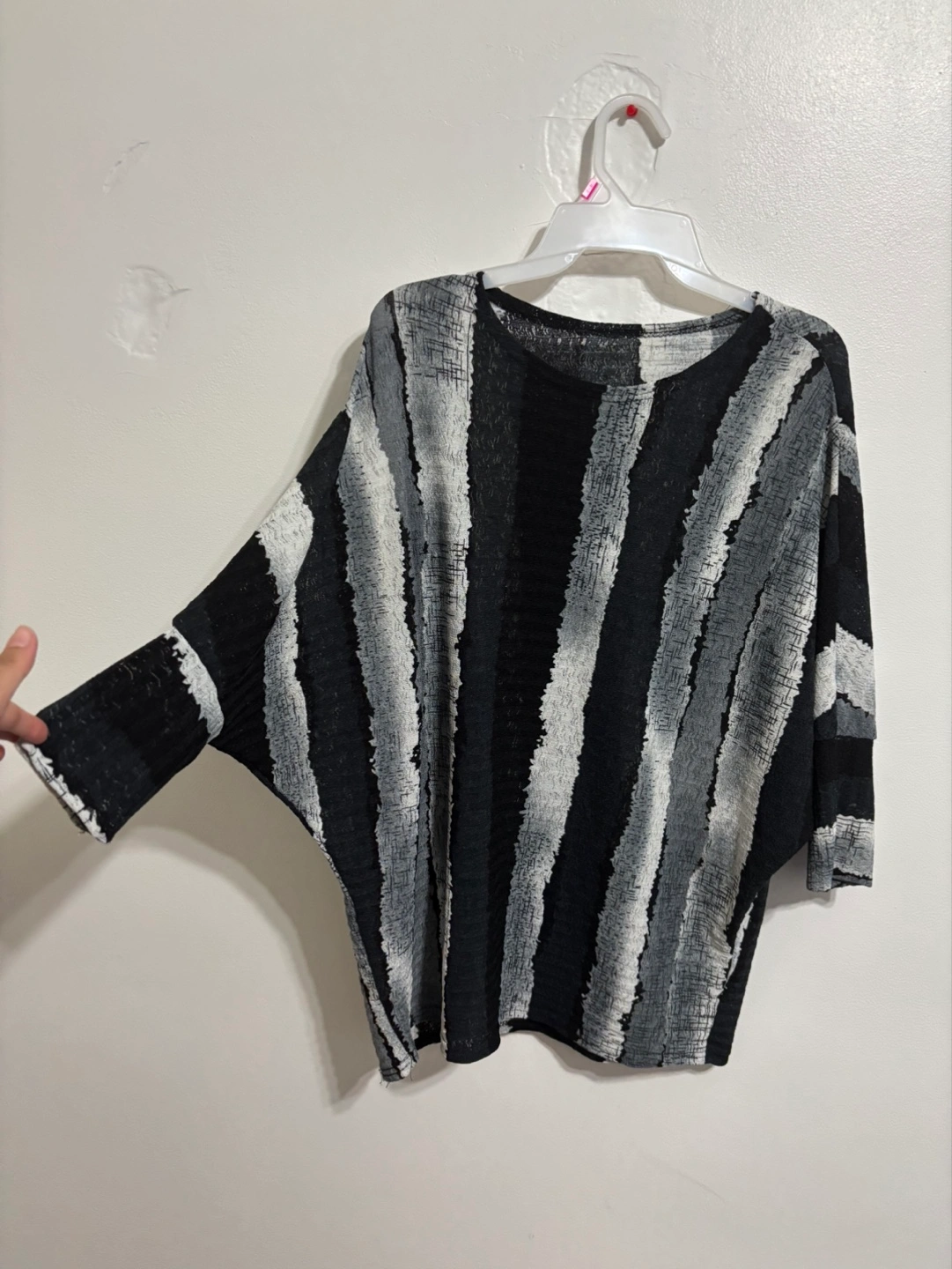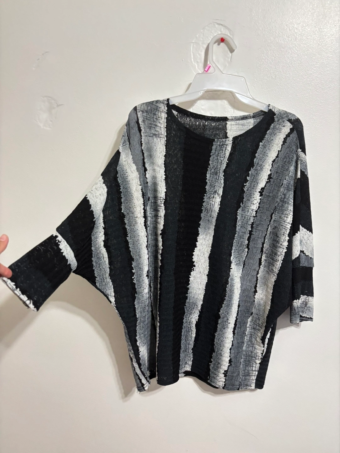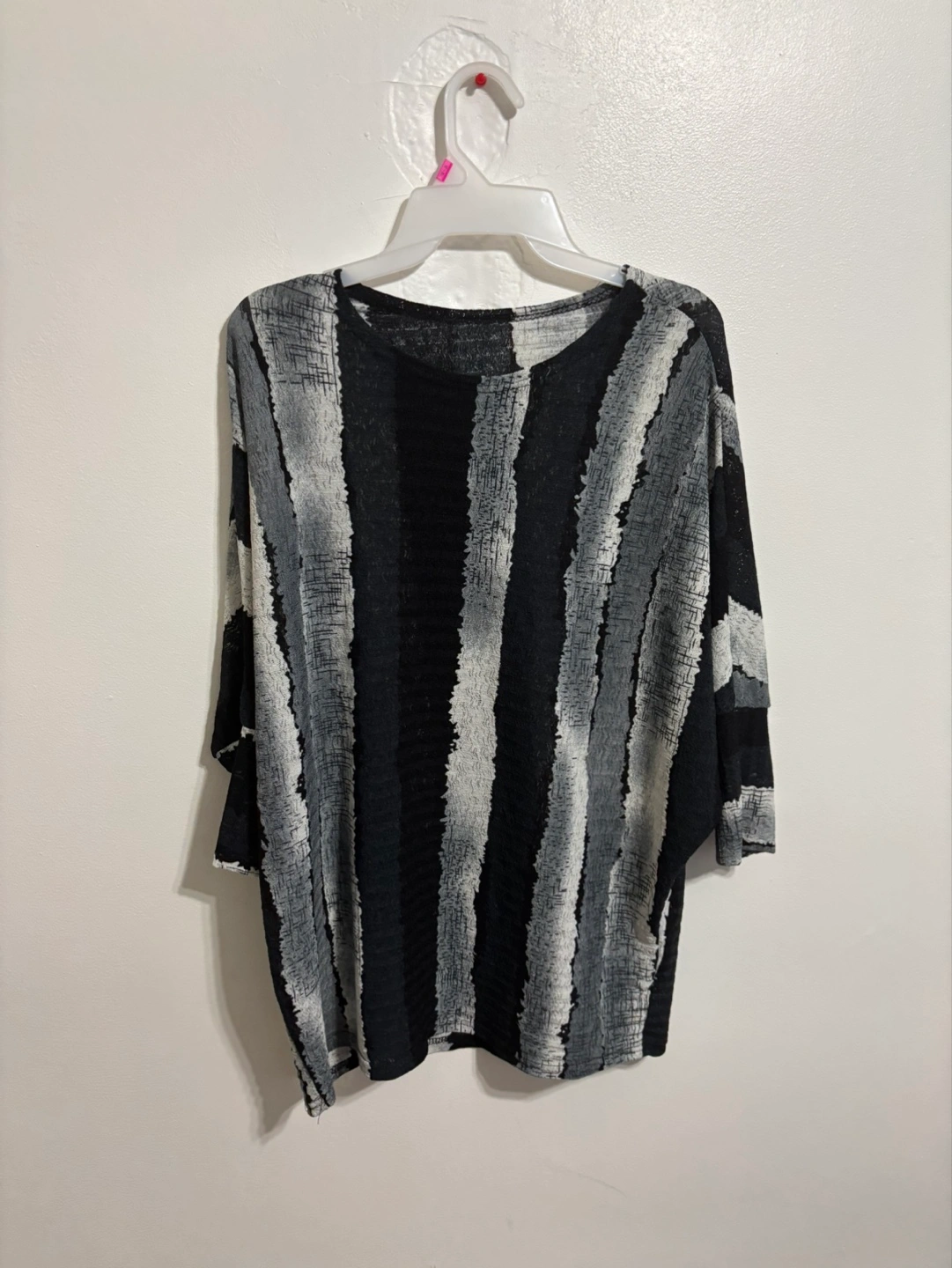 Lightweight knit top. Black, white, and grey vertical stripes. Relaxed fit. Three-quarter sleeves. Round neckline.