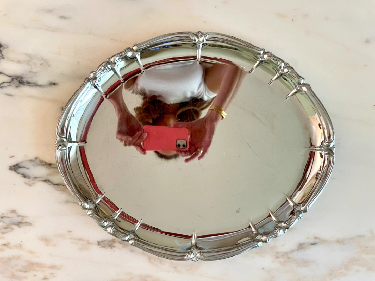 Selling a stainless steel chrome tray platter with a beautiful scalloped edge.