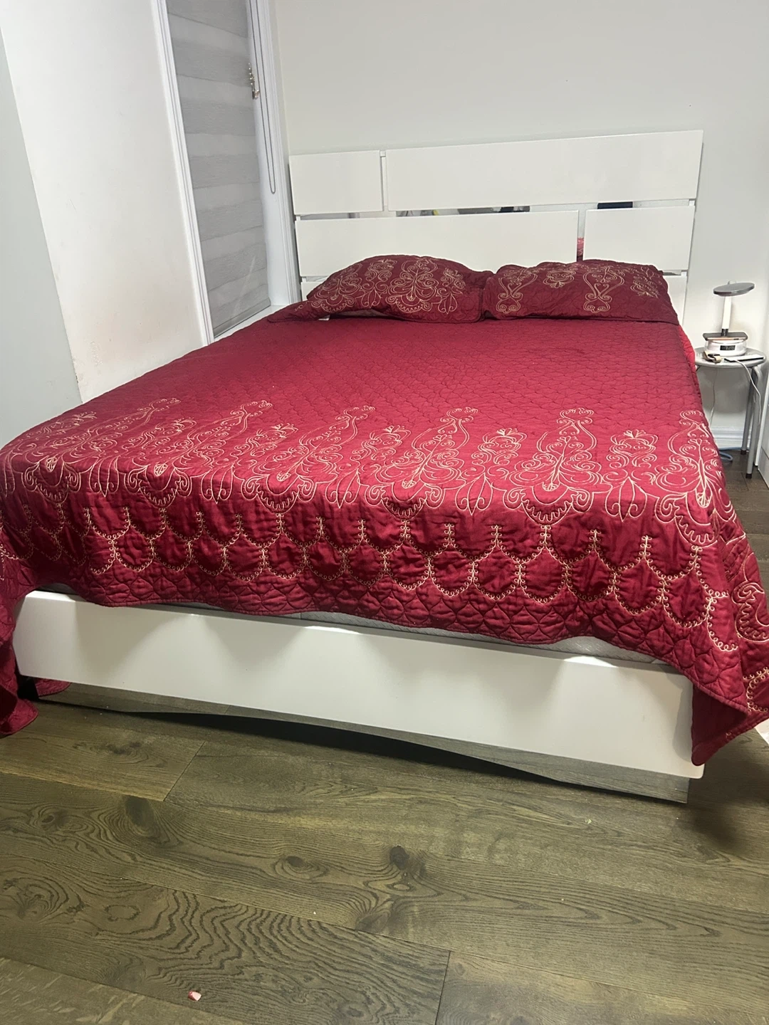 White modern queen bed frame with a stylish headboard. Adds a touch of elegance to any bedroom! Mattress and duvet not included only bed frame!