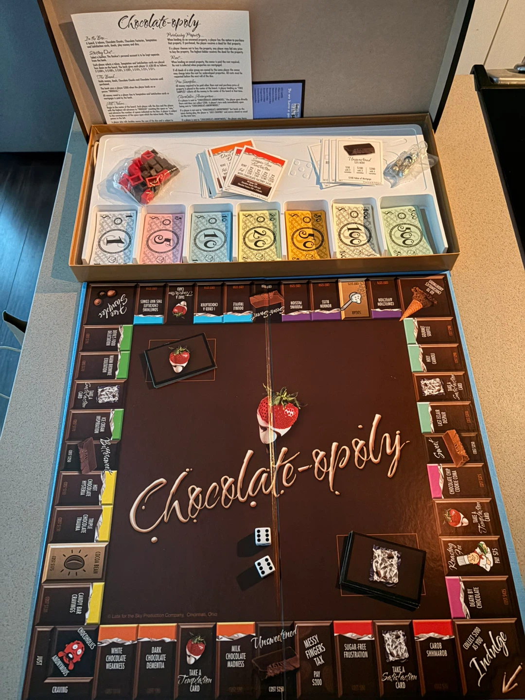 Selling a Chocolate-opoly board game! It's a decadently delicious property trading game for chocolate lovers. All pieces are included and in great shape. Ready for a new home!
