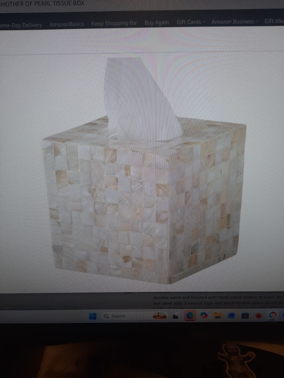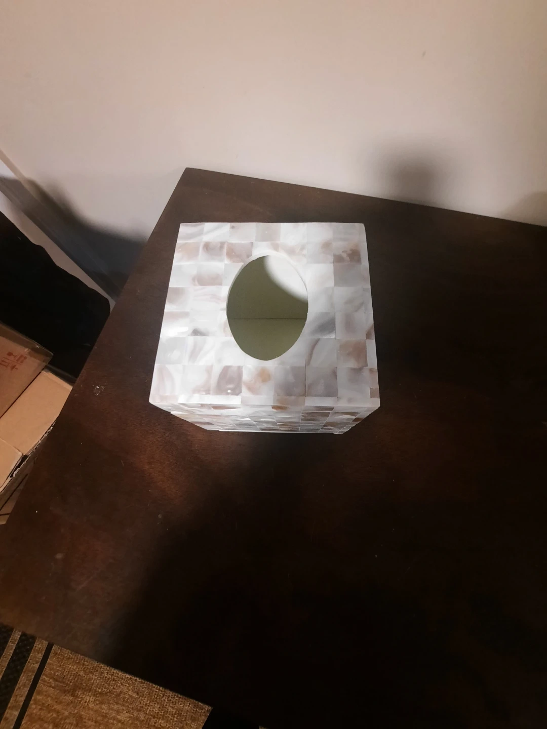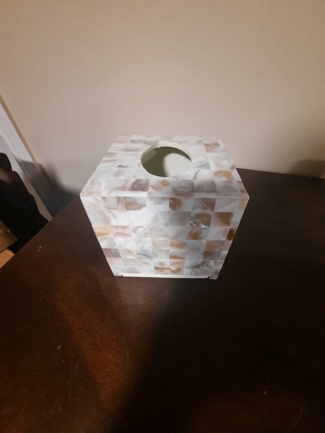 Beautiful mother of pearl tissue box cover! It's made with hand-inlaid mother of pearl for a natural, high-touch look. This square cover fits standard tissue boxes.