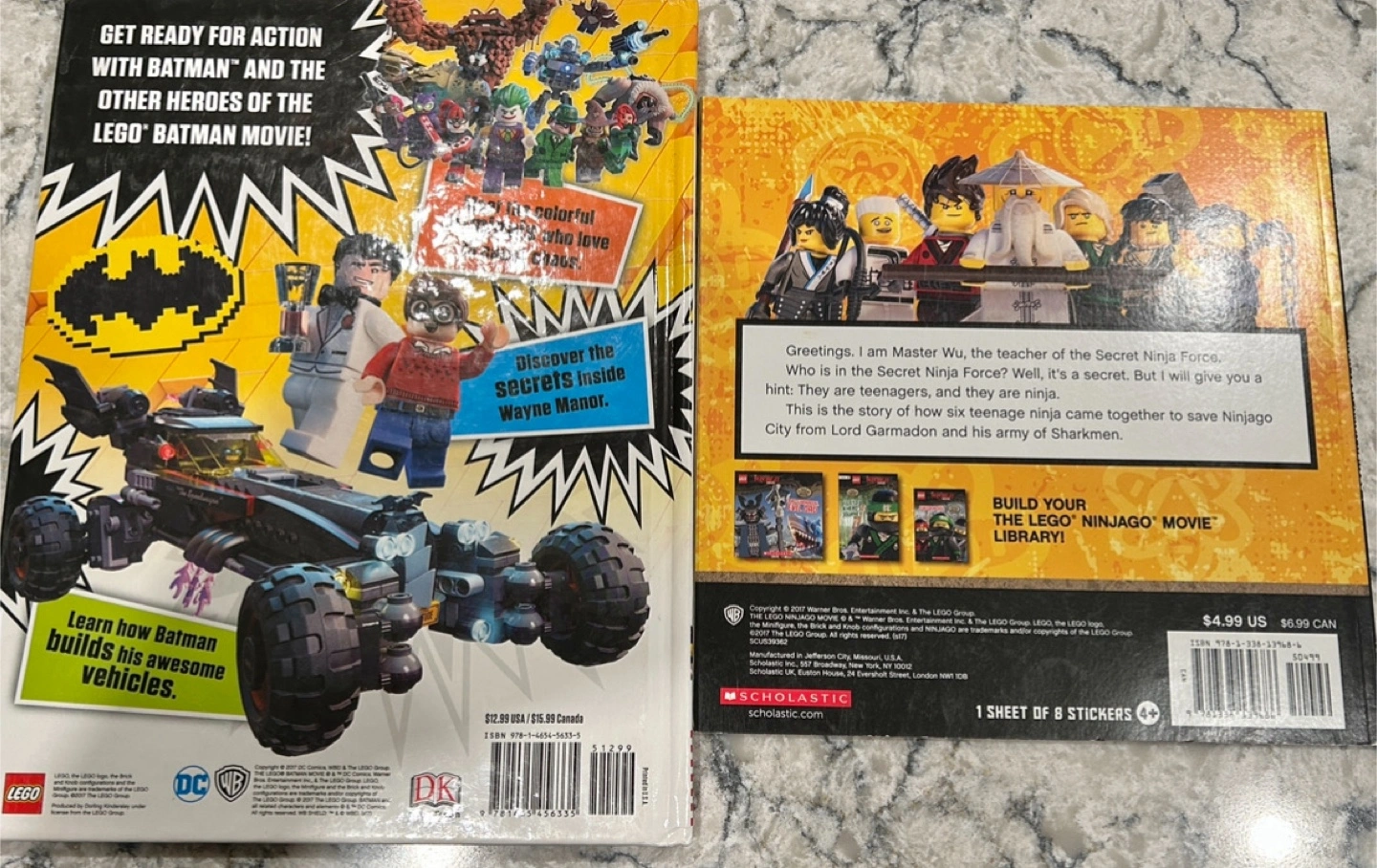 Pair of LEGO movie books: The LEGO Batman Movie: The Essential Guide, and The LEGO Ninjago Movie: High-Tech Ninja Heroes.