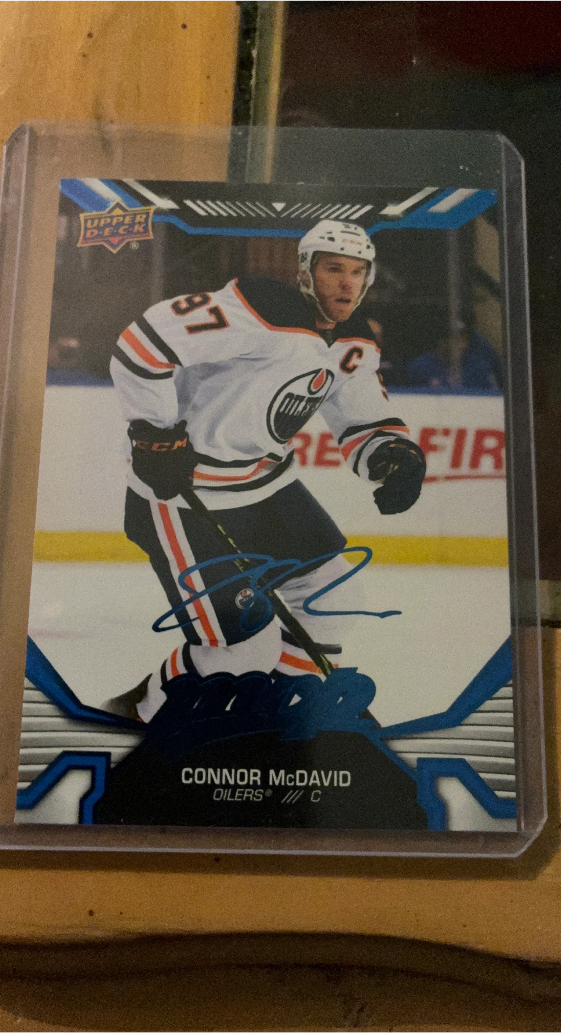 This is a Connor McDavid Upper Deck hockey card featuring his autograph. It showcases the Edmonton Oilers player in his team's jersey. A great collectible for any hockey fan!
