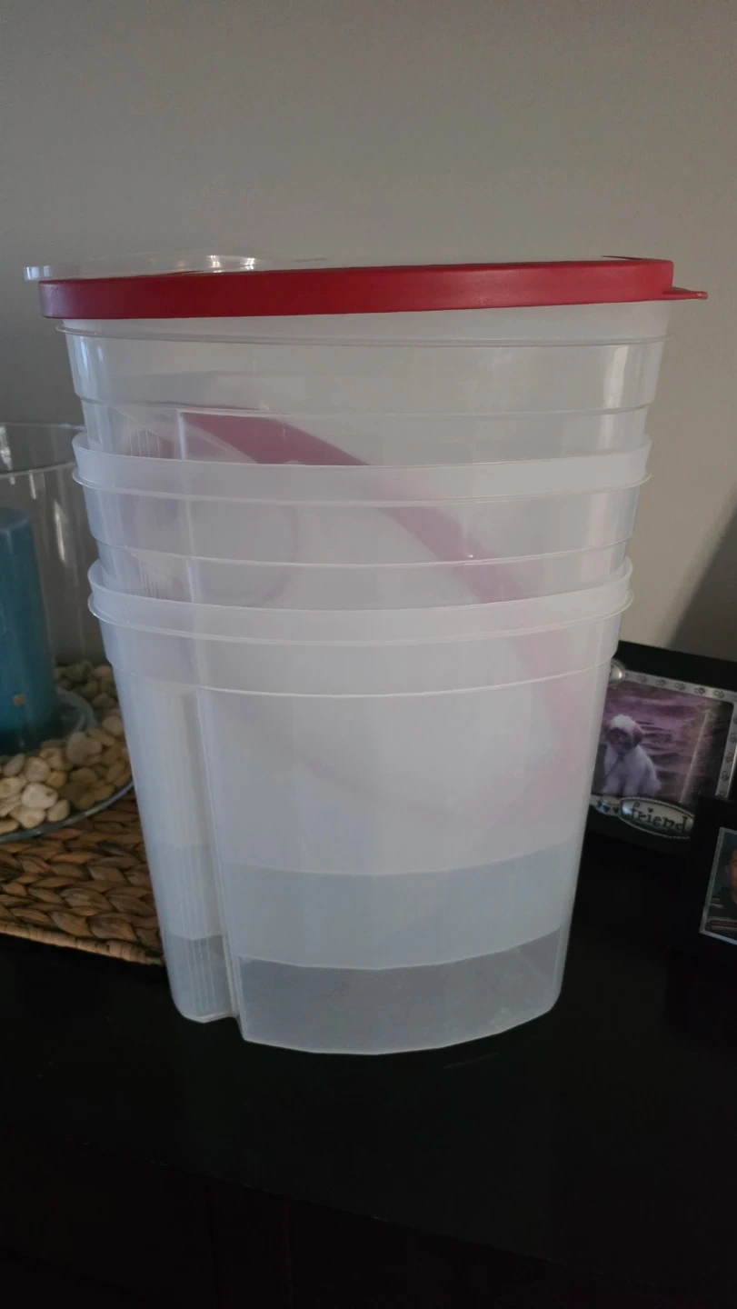 Set of clear, stackable cereal size storage containers. They have bright red lids for a secure seal. Perfect for organizing your pantry or fridge. 3 containers with lids included.