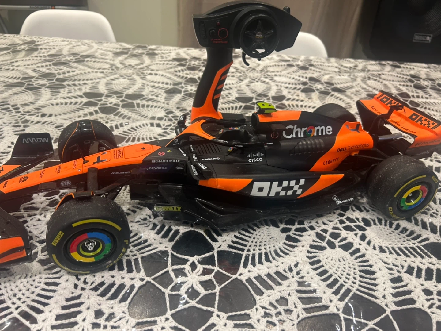 This is a remote-controlled McLaren Formula 1 race car. It comes with a remote for easy operation. Fun for racing enthusiasts!