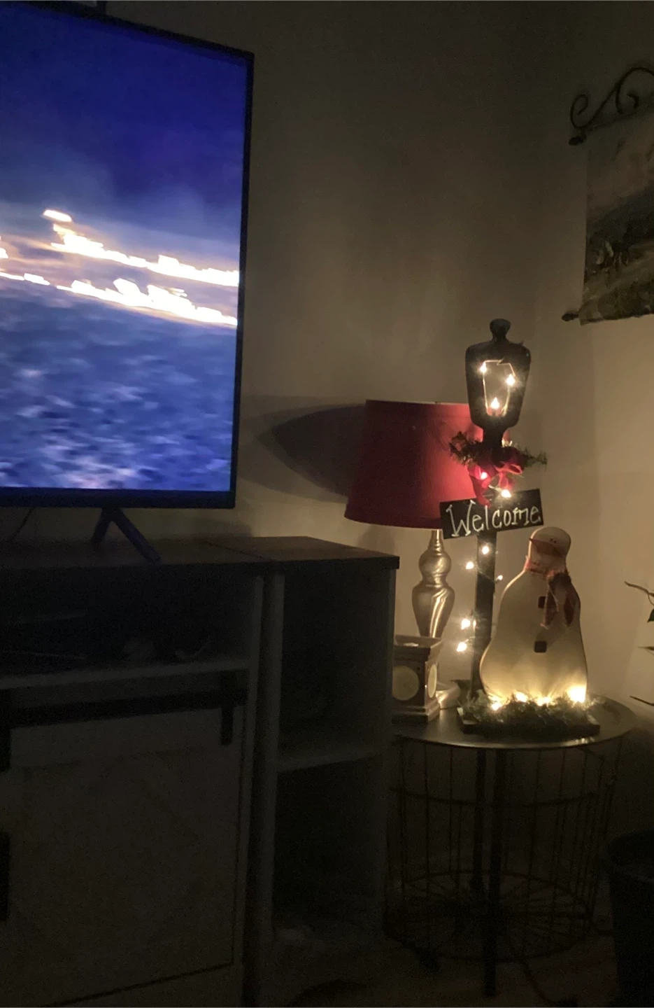 Cute lamp post decoration with a snowman and a 'Welcome' sign. It's perfect for adding a cozy touch to your home during the holidays