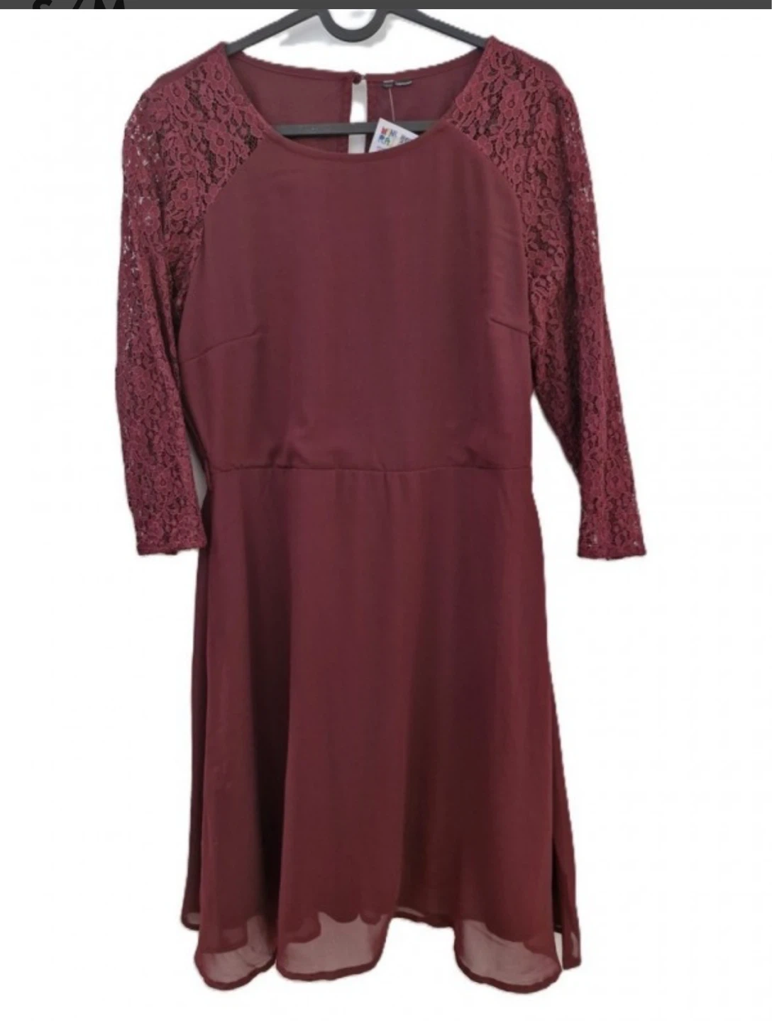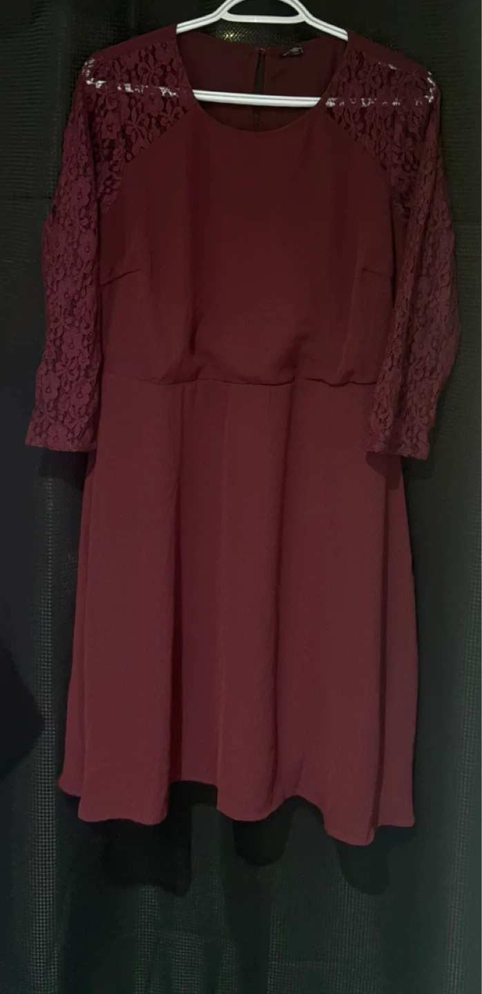 This maroon dress features elegant lace sleeves and a cinched waist for a flattering fit. It's made of a comfortable, flowing fabric. This dress is perfect for a night out or a special occasion!