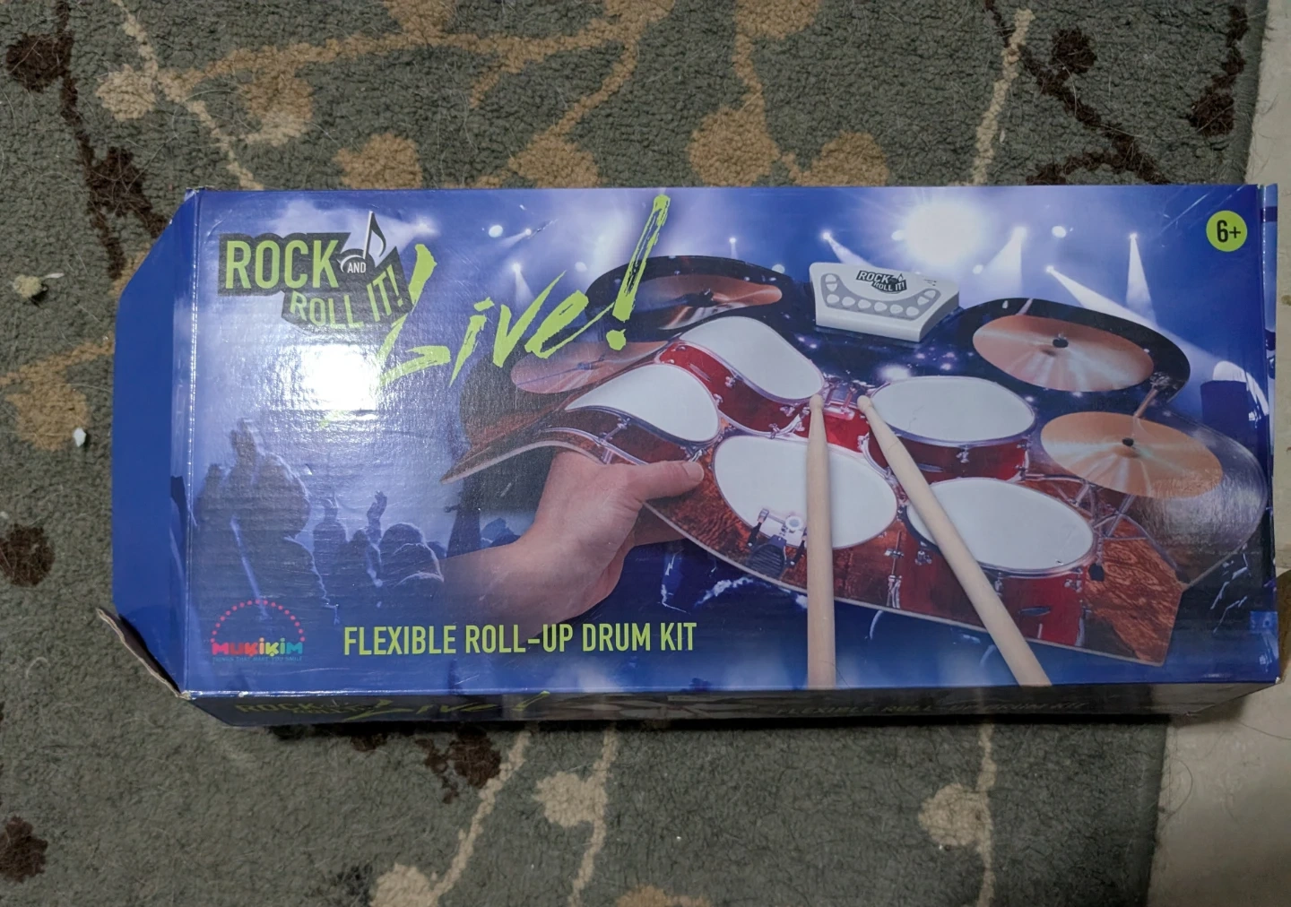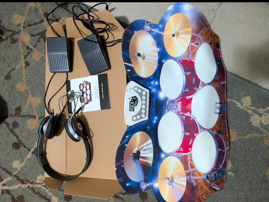 This is the Rock and Roll it Live! flexible roll-up drum kit, a flexible, portable silicone drum pad designed to look like a live concert drum set. It's a fun way to get started with drumming. Includes multiple drum tones, professional demo songs, recording and playback capabilities, and auxiliary input allowing connection to MP3 players. Comes with drum mat, headphones, two foot pedals, and instructions. Open drum size is 22.25"x 1.75" x 1", made from silicone and plastic.