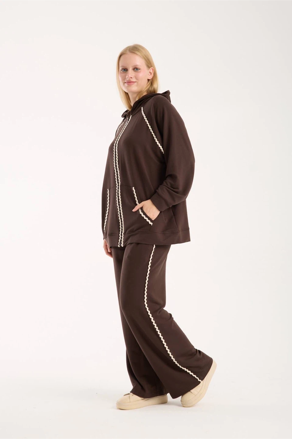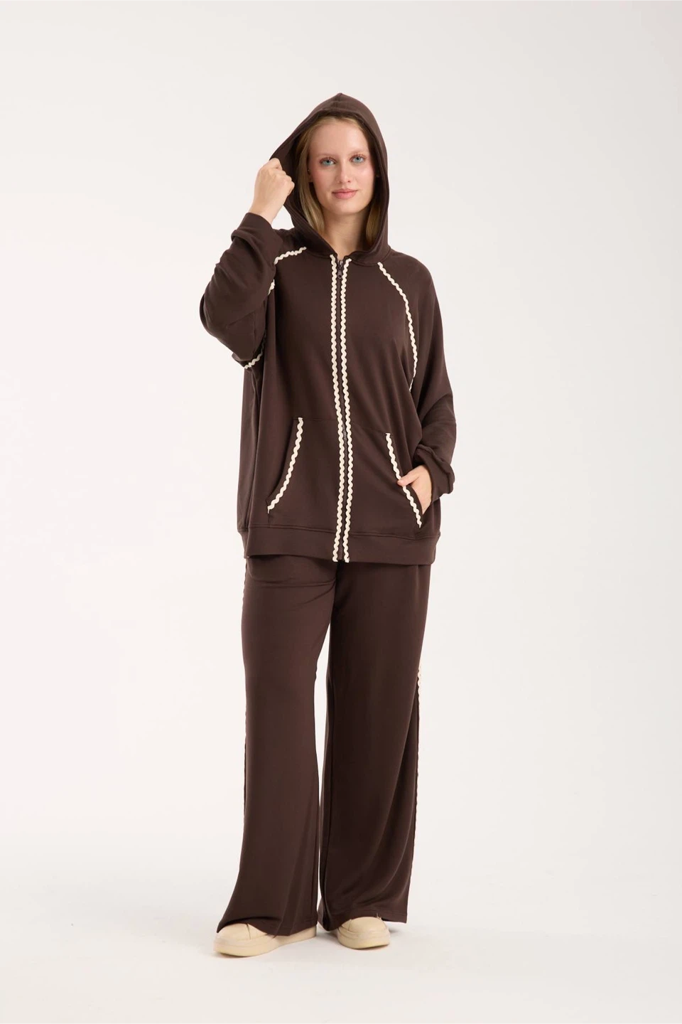 Made in Turkey. Comfy brown hoodie and pants set! The set features a zip-up hoodie and wide-leg pants, both accented with a unique scalloped trim. Great for lounging or casual outings