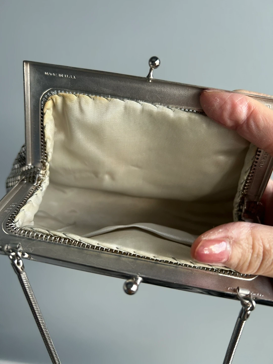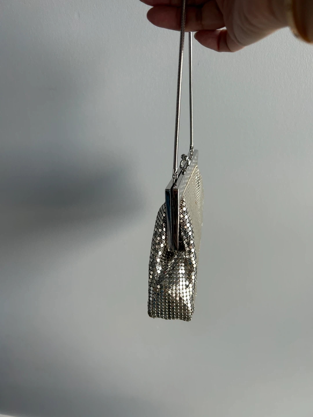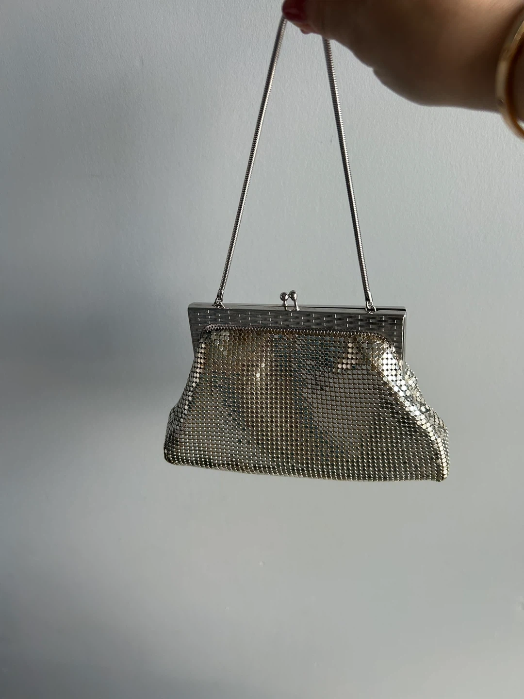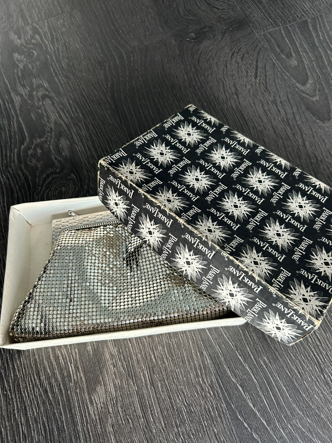 This vintage Park Lane evening clutch is made of shimmering silver mesh and comes with its original box. It features a kiss-lock closure and a delicate snake chain strap. Perfect for adding a touch of sparkle to any formal outfit!