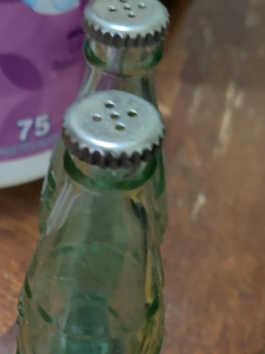 Heavy glass,,A pair of vintage green glass salt and pepper shakers with metal tops. They have a classic soda bottle shape. These shakers are perfect for adding a retro touch to your kitchen table.