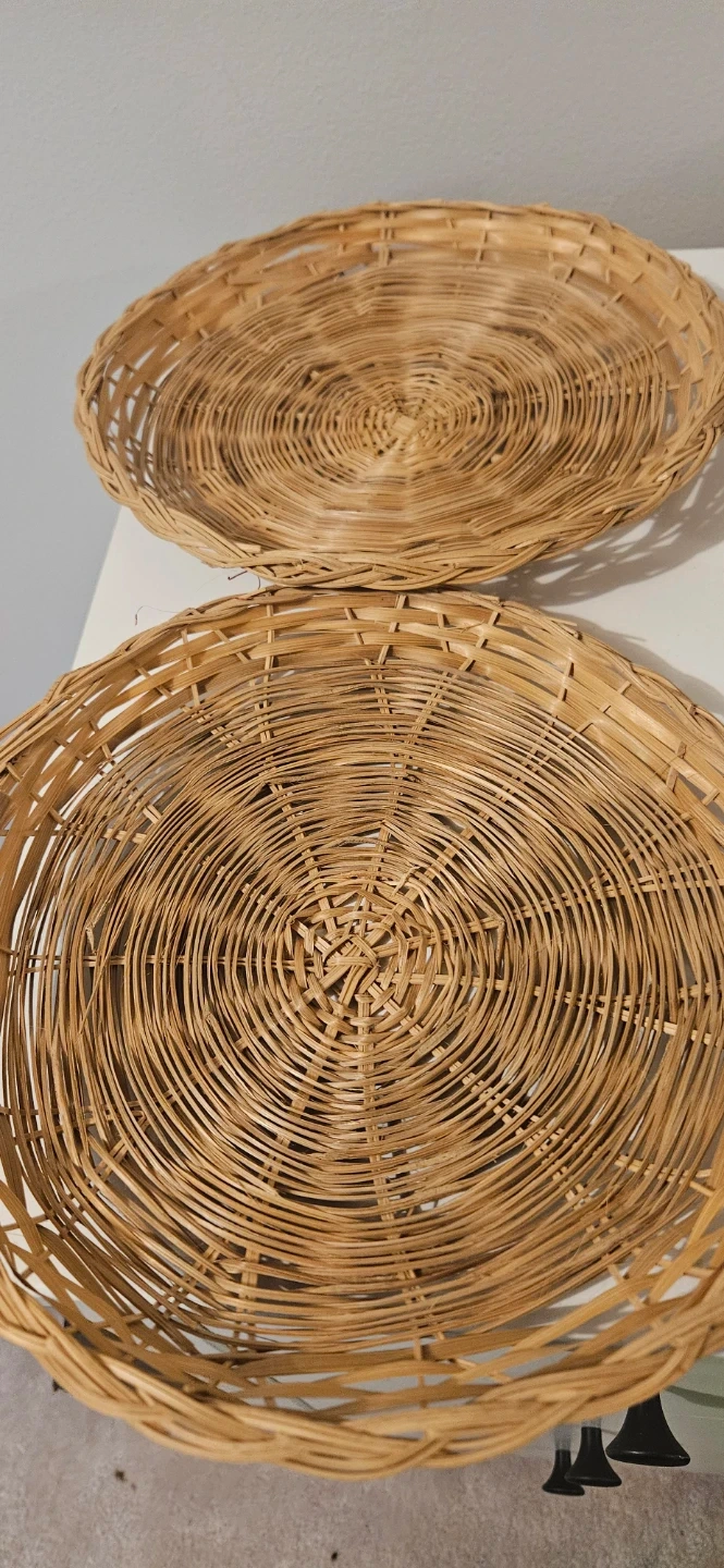 Two round woven trays are up for grabs. These baskets are made from a natural wicker material and are great for serving snacks or organizing small items. They'd be handy for a picnic or to add a rustic touch to your home decor!