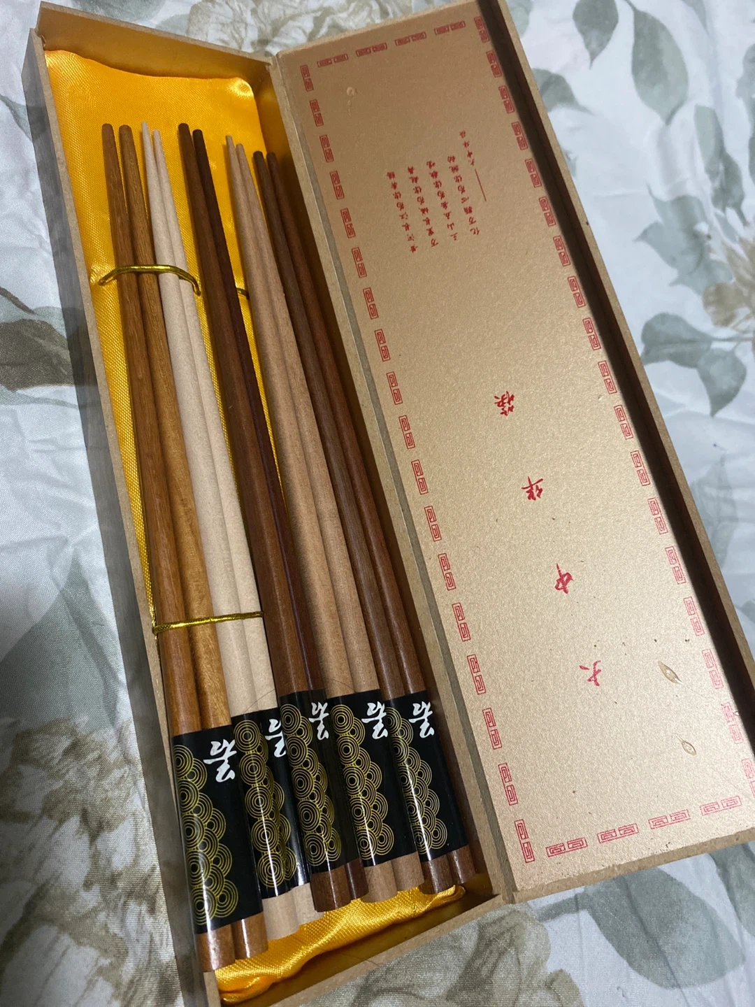 Set of 5 pairs of chopsticks in various wood tones. They come in a decorative gift box. Great for Asian cuisine! NEW & UNUSED