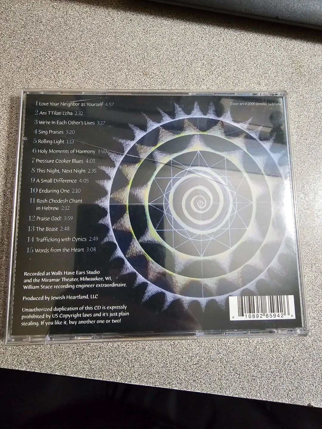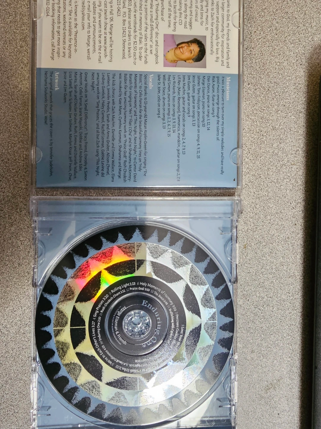 This CD features the album 'Enduring One' by Marge Eiseman & Friends. It includes 15 tracks with various musicians and vocalists. Recorded at Walls Have Ears Studio.