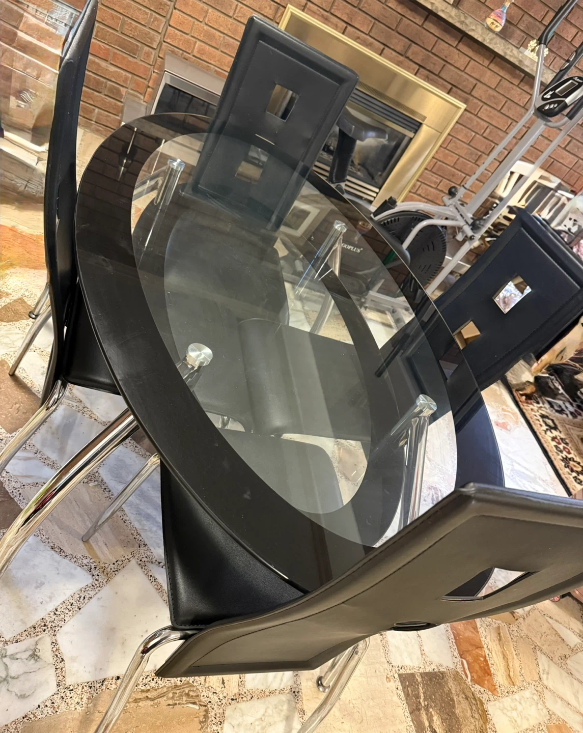 Glass top dining table with a black metal frame, comes with four black faux leather chairs. Chairs have chrome legs. This set includes decorative placemats.