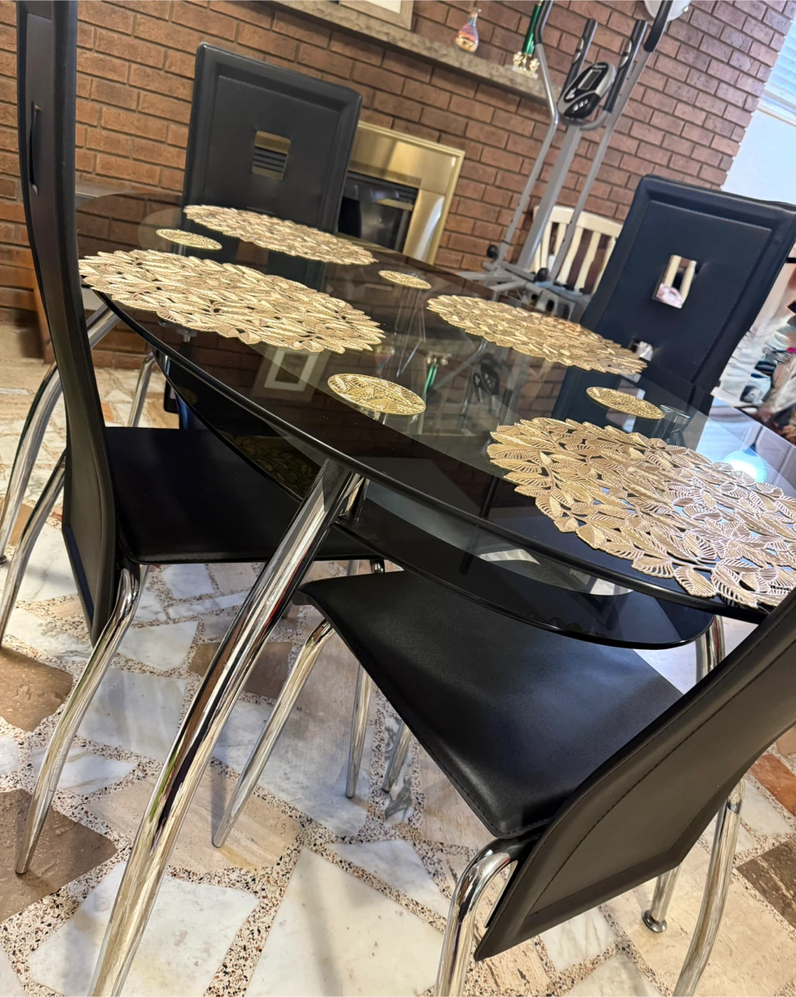 Glass top dining table with a black metal frame, comes with four black faux leather chairs. Chairs have chrome legs. This set includes decorative placemats.