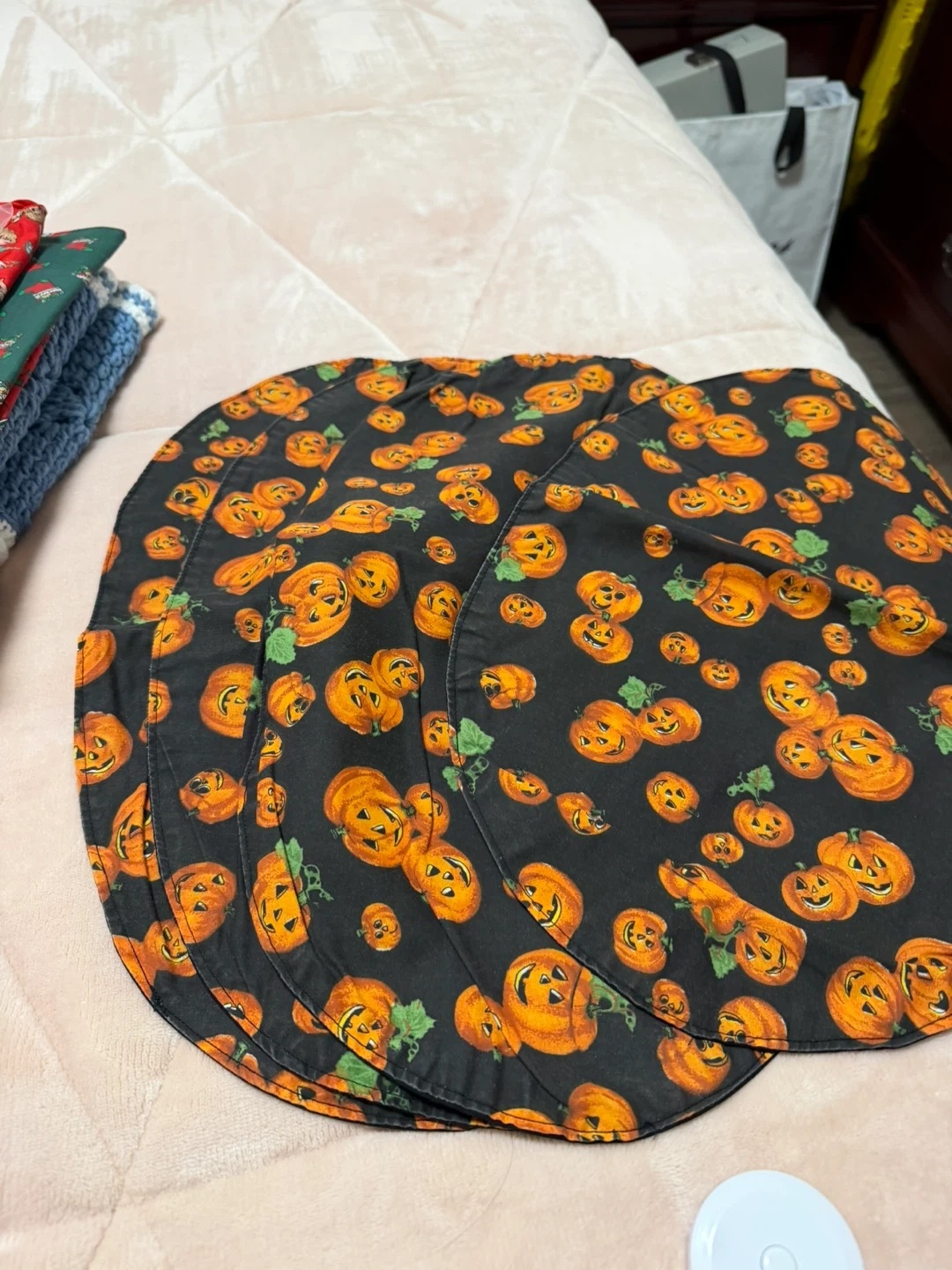 These placemats feature a fun all-over jack-o'-lantern print on a black background. They're perfect for your Halloween table setting. Set of four.