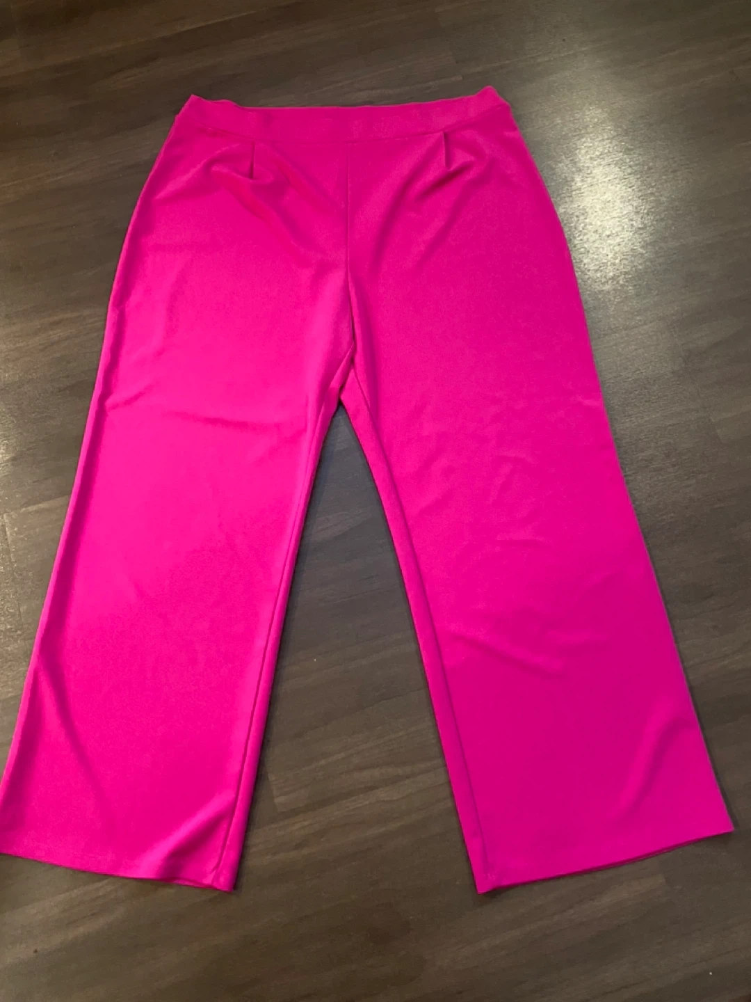 These Fashion Nova pants are a vibrant pink colour. They're a wide leg style with a comfortable fit. Looks like a polyester blend.