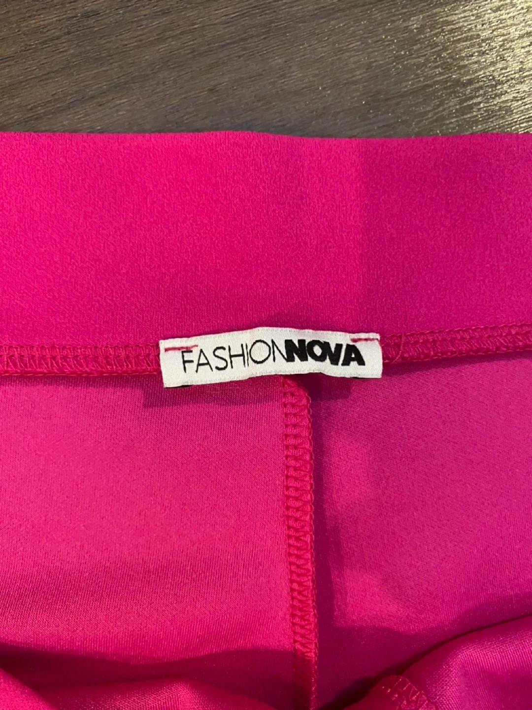 These Fashion Nova pants are a vibrant pink colour. They're a wide leg style with a comfortable fit. Looks like a polyester blend.