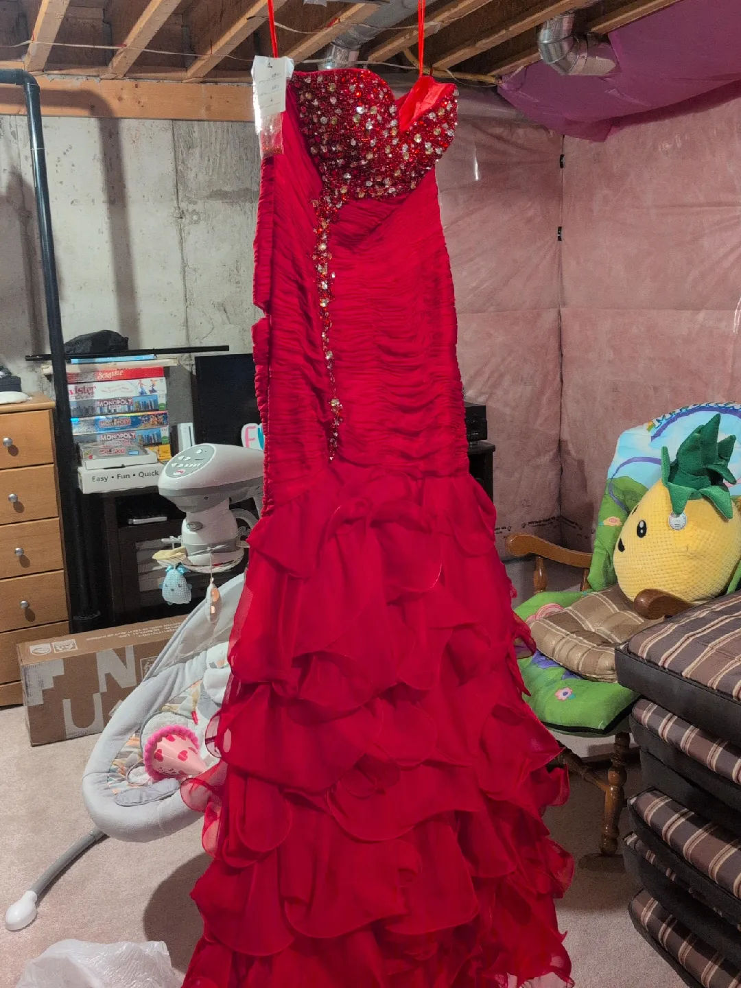 Beautiful red formal dress with beaded bodice and layered skirt. Perfect for prom or a special occasion! It's in great condition and ready for a new home