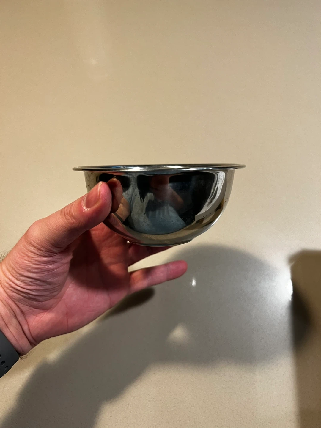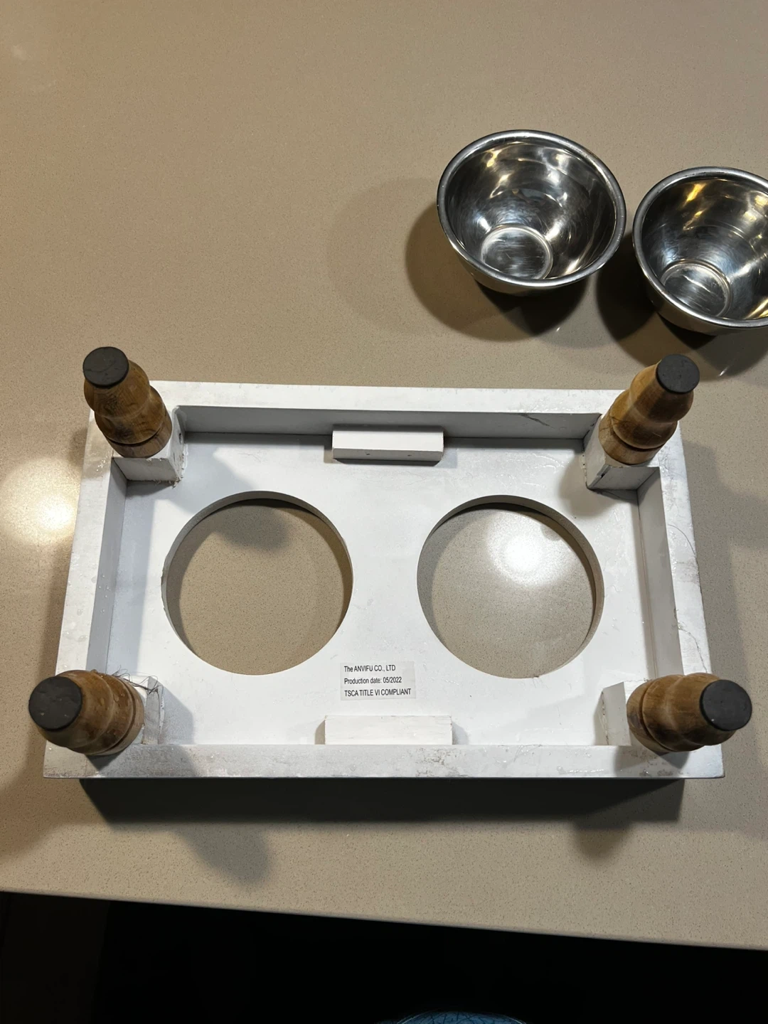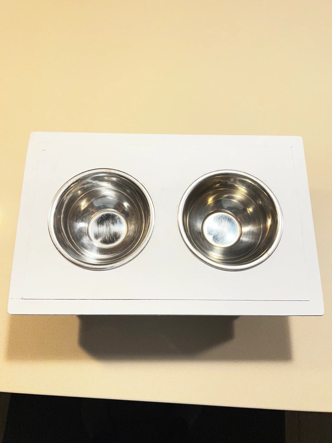 This elevated feeder holds two stainless steel bowls, perfect for dogs or cats. The stand is made of a durable grey material and has small wooden legs. Easy to clean and keeps food and water accessible. 13 inches from the sides and 8 3/8 inches width
