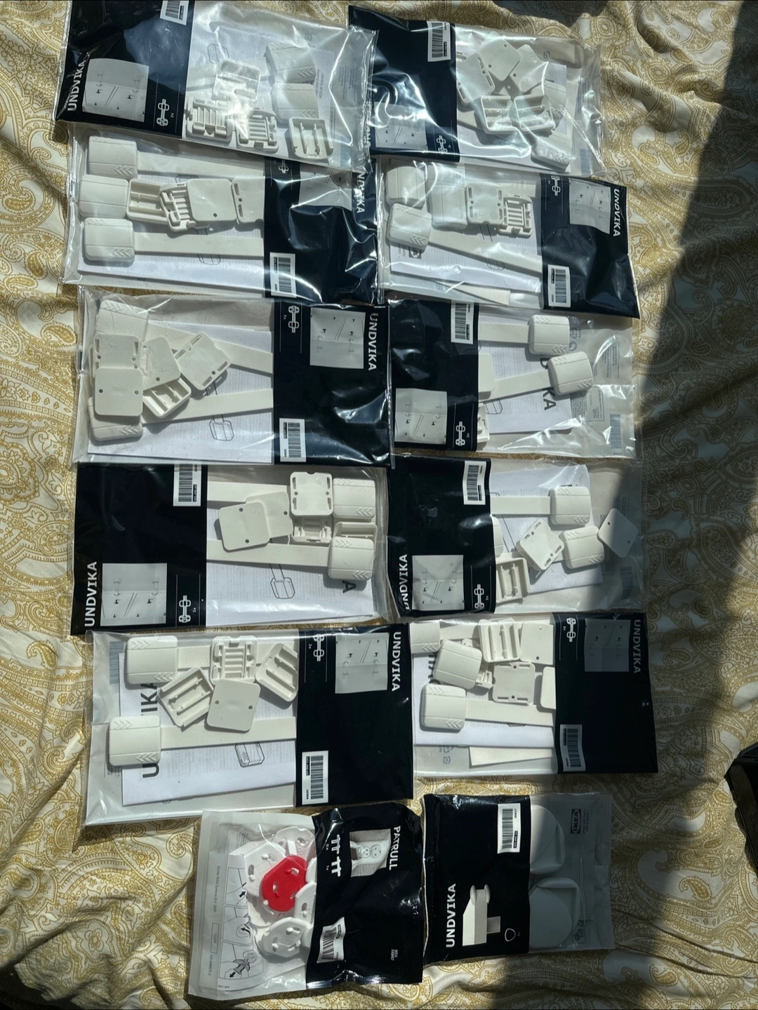 Ten packages of IKEA UNDVIKA child safety locks for cabinets and drawers. White plastic components. Includes instructions. Also includes one package of IKEA PATRULL outlet covers.
