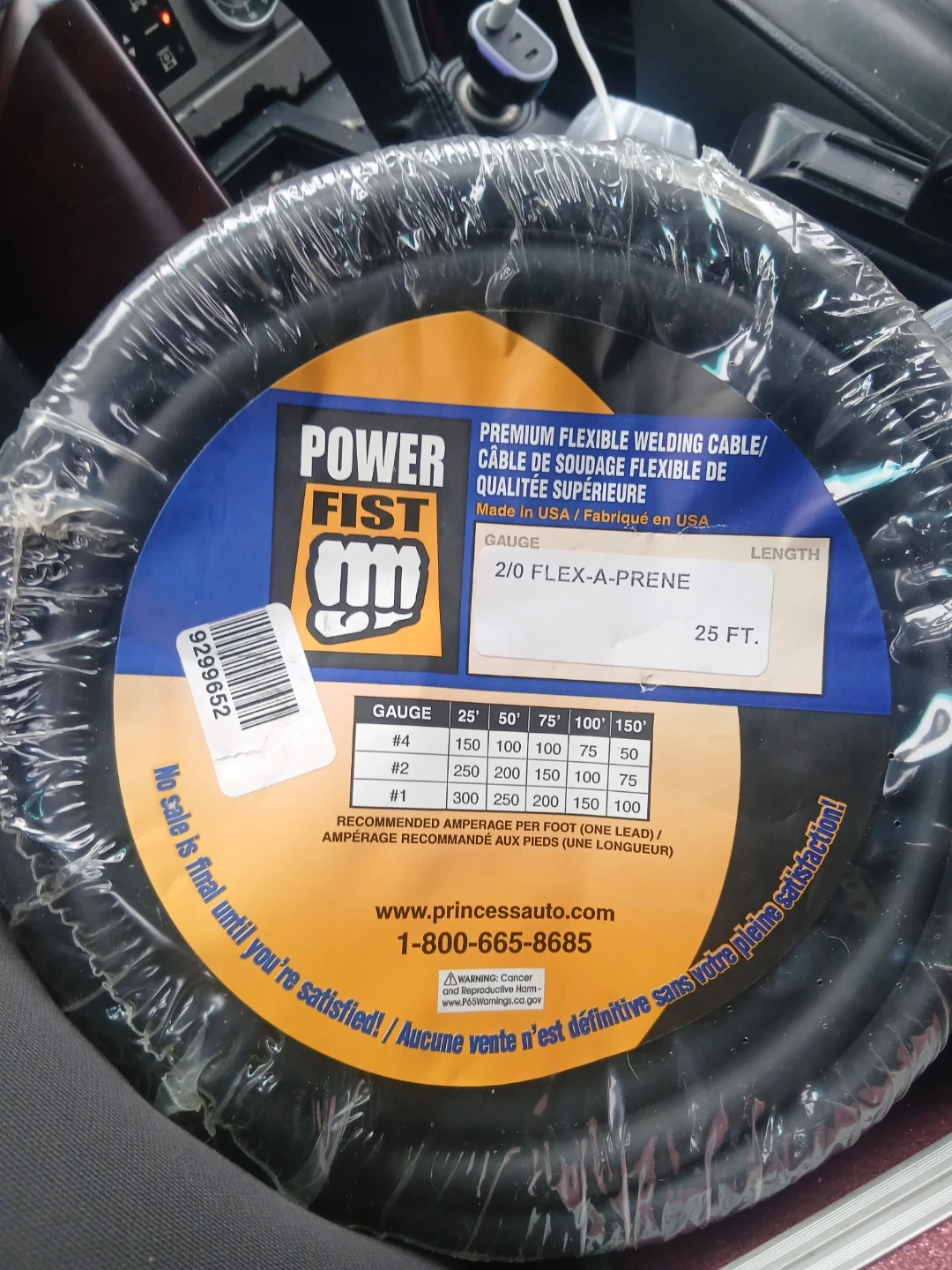 This is a 25 ft roll of premium flexible welding cable by Power Fist. It's 2/0 gauge FLEX-A-PRENE, made in USA. Recommended amperage per foot is also listed on the packaging. Original price $279.00 at princess auto