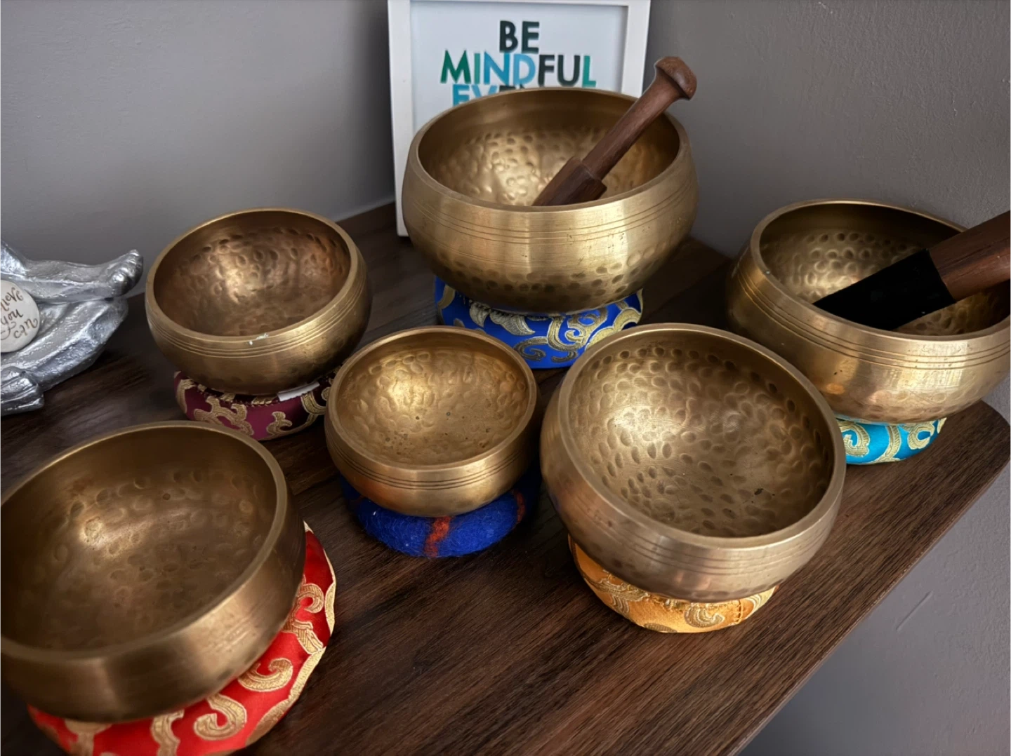 This set includes six Tibetan singing bowls made of brass. Each bowl has a unique hammered design and comes with a wooden mallet. These bowls are often used for meditation and relaxation.