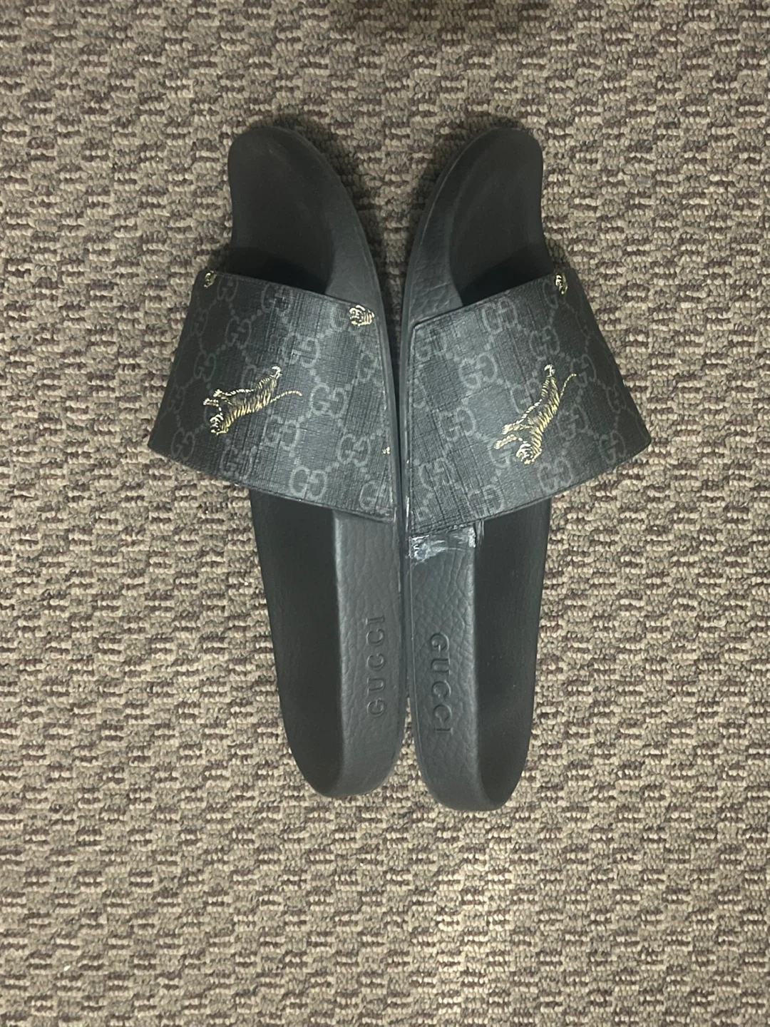 Selling the pair of Gucci Slide GG Supreme Tigers in US men's size 9.5 for $30.00 They have some signs of wear, as shown in the pictures as well as glue stain on side of one shoe but still wearable