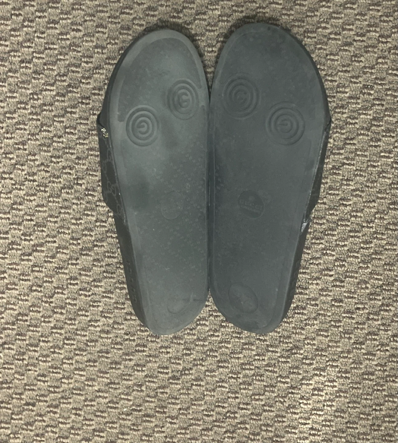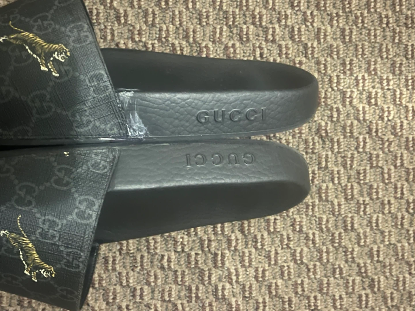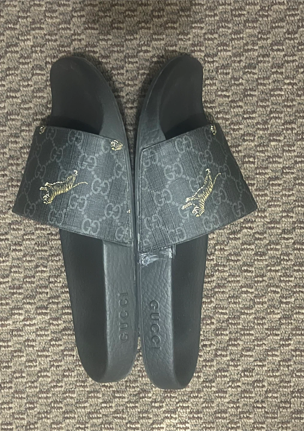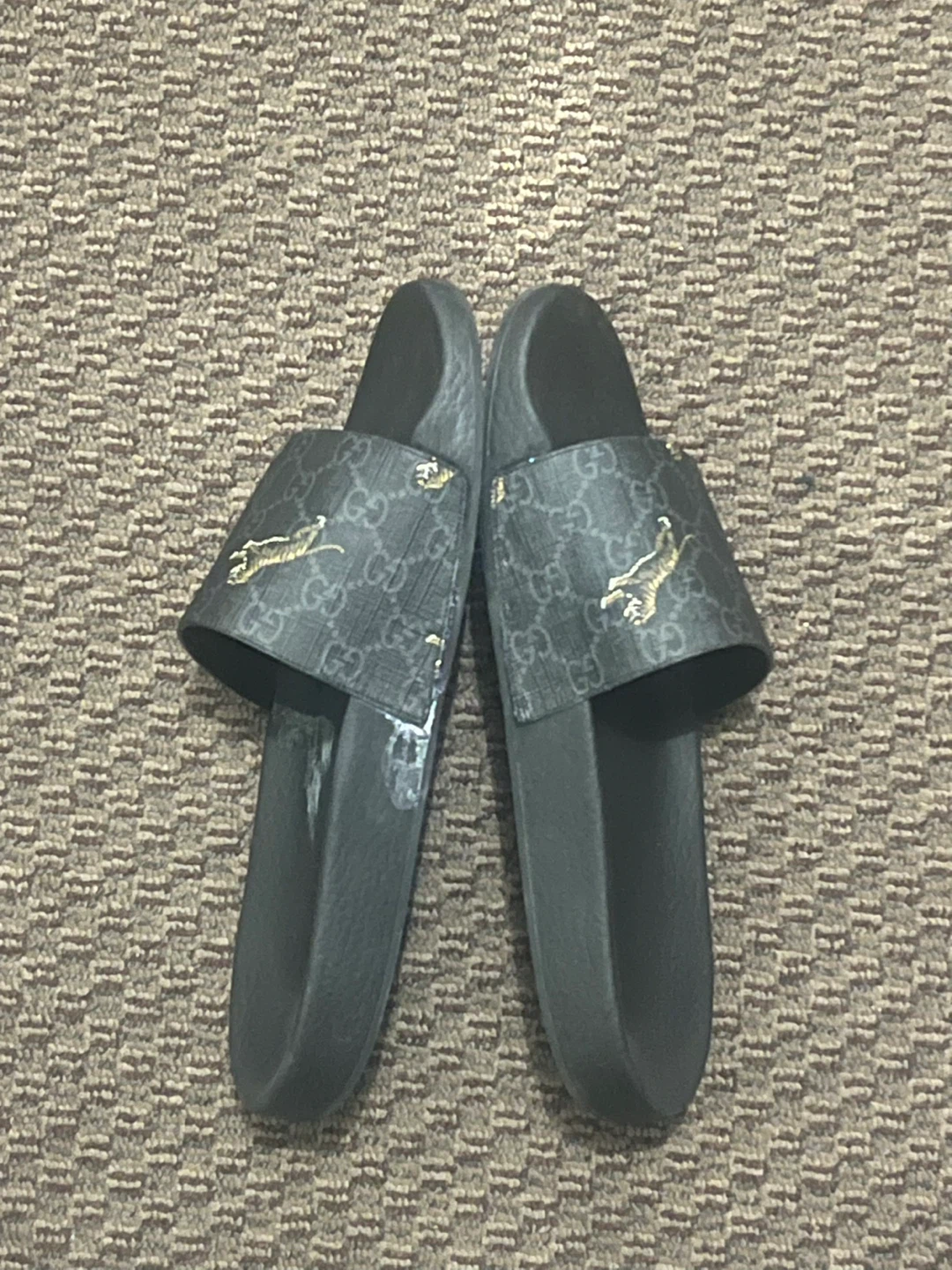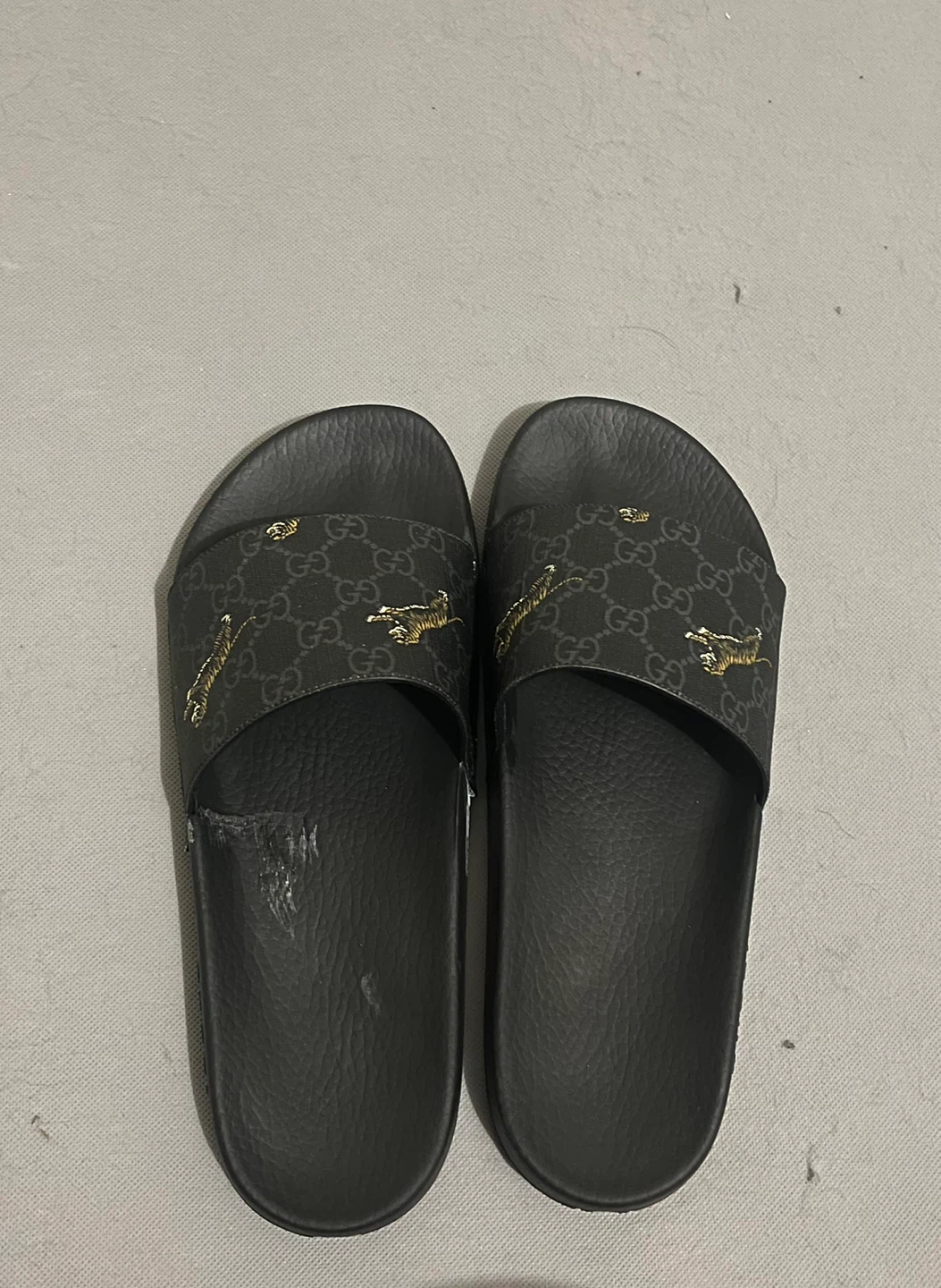 Selling the pair of Gucci Slide GG Supreme Tigers in US men's size 9.5 for $30.00 They have some signs of wear, as shown in the pictures as well as glue stain on side of one shoe but still wearable