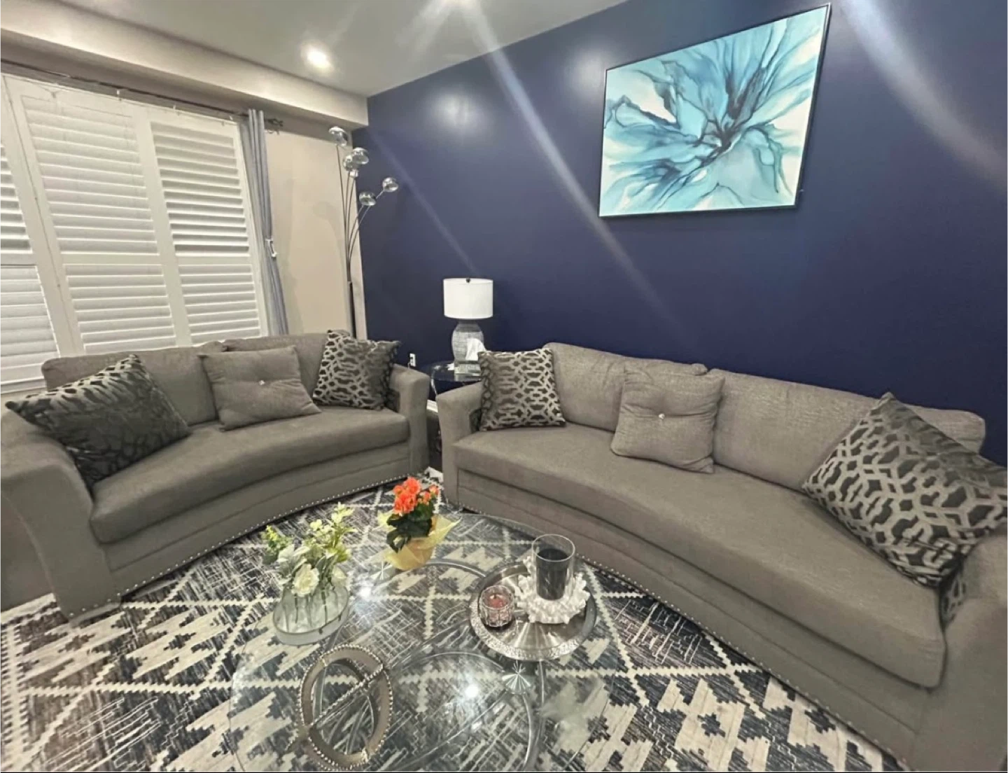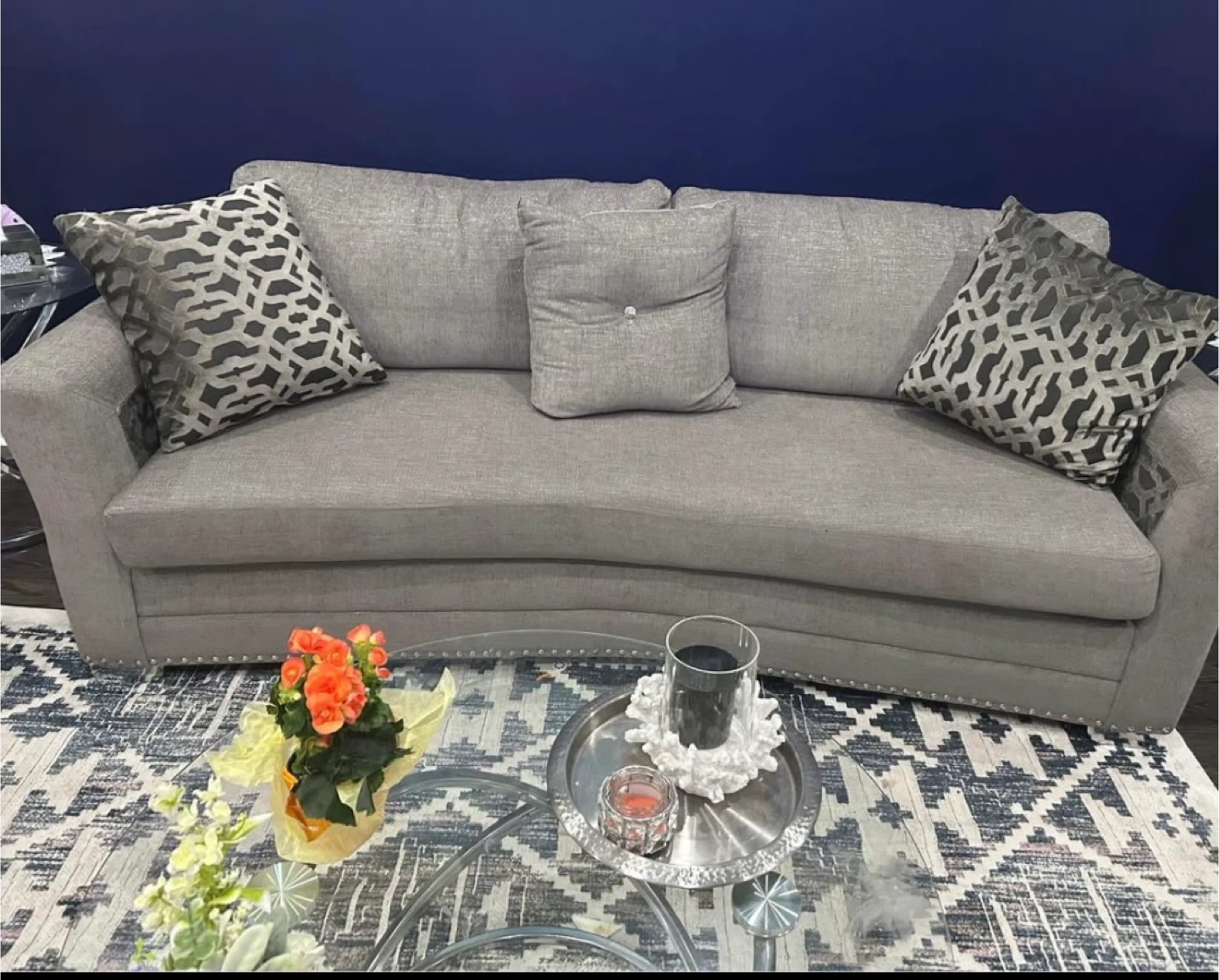 A comfortable grey fabric sofa set with a gentle curve, perfect for any living room. It comes with decorative accent pillows. Just few year old in mint condition. Pet free home. Move out sale