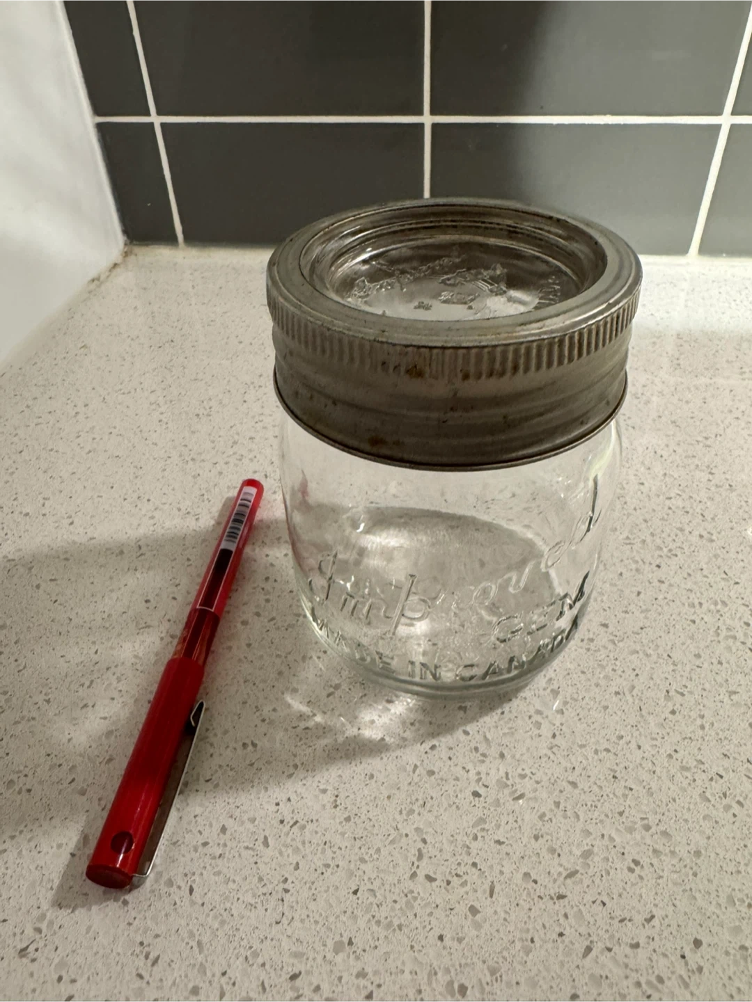 A vintage Improved gem mason jar. Made in Canada, it features a clear glass bottle with a lid to keep your items fresh. The jar is perfect for storing small items, such as candies, cotton balls, or even using as a vase for your favorite flowers. The brand is known for its quality and durability, making this jar a great piece for any collector.