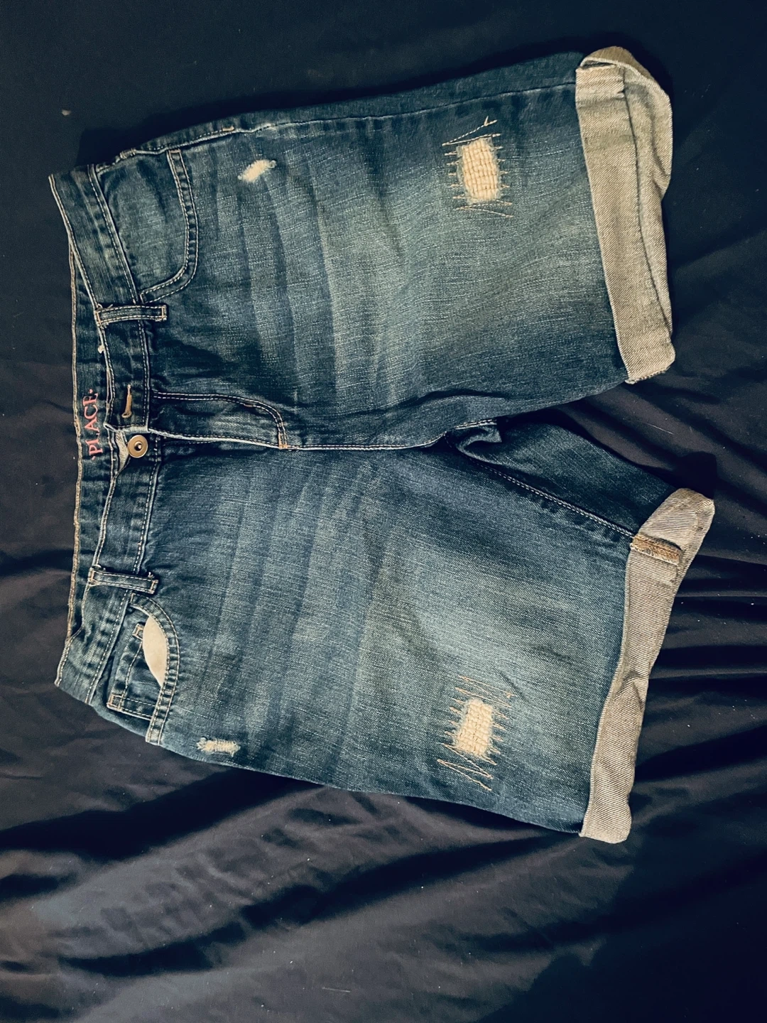 Distressed denim shorts from The Children's Place. These shorts feature a cuffed hem and stylish distressing. Made of denim material.