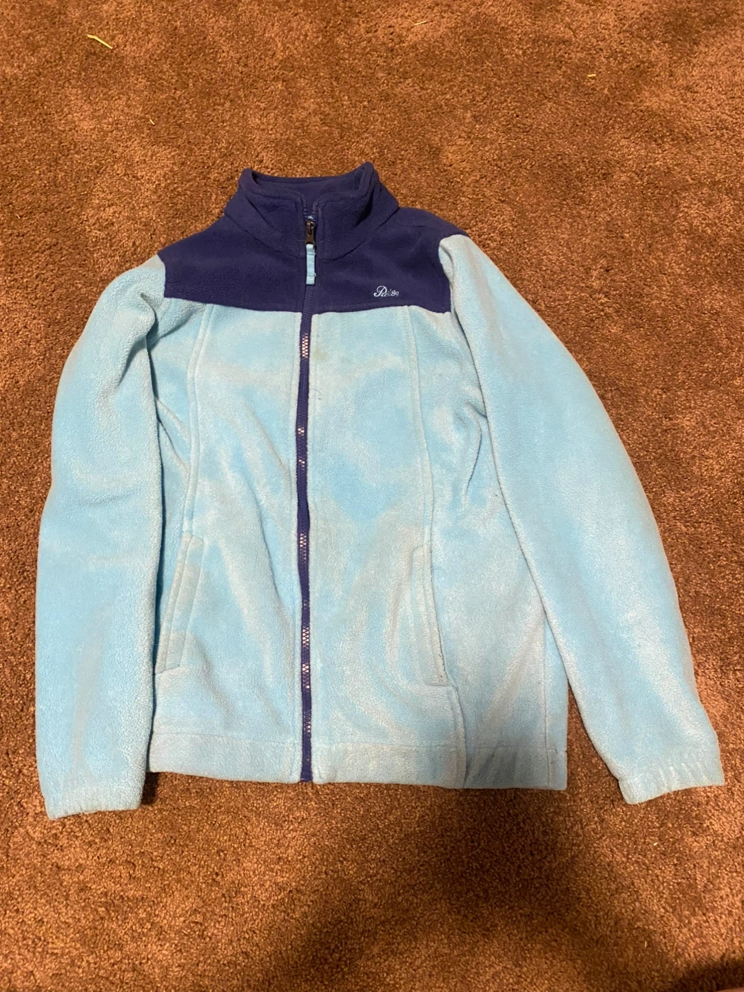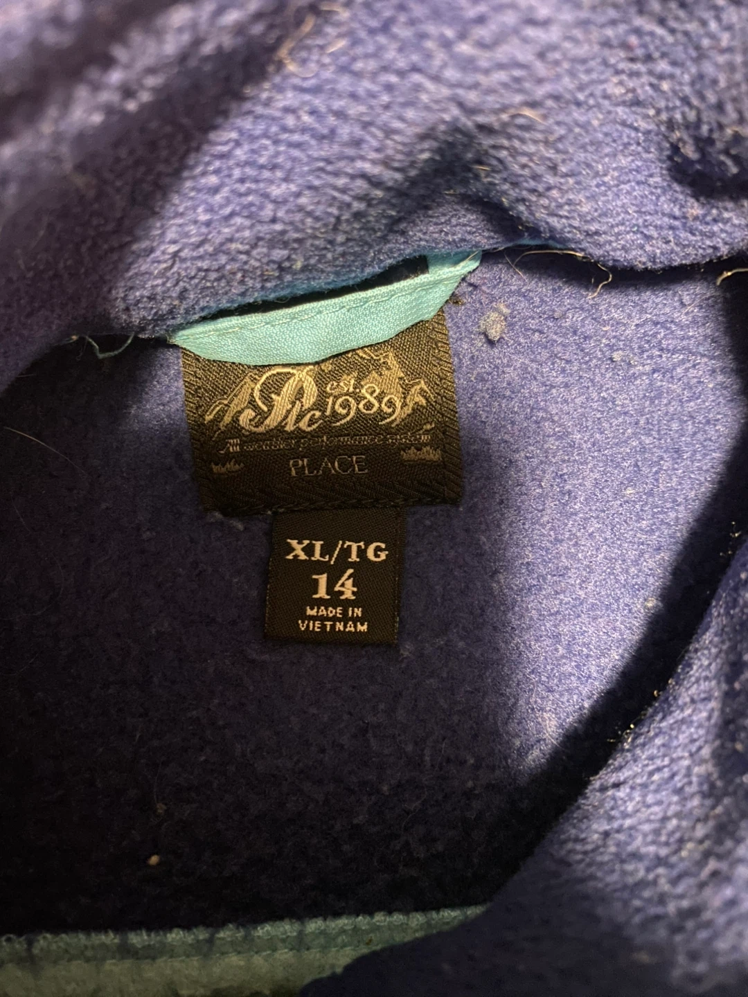 This Children's Place fleece jacket is a size XL or TG, equivalent to a size 14. It's made in Vietnam and features a light blue body with a navy blue collar and shoulder panel. This cozy jacket is perfect for staying warm on cooler days!