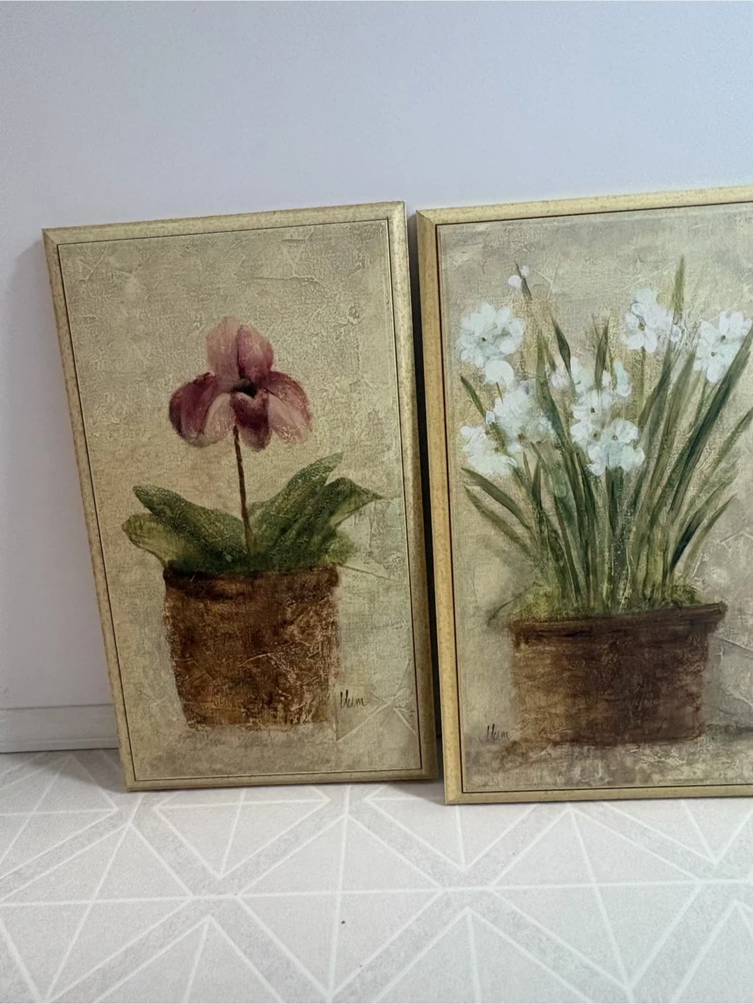 This set features two framed art prints of potted flowers. One print displays a single orchid, while the other shows a cluster of white blooms. They're framed in a light gold-toned finish. Pick up cash only