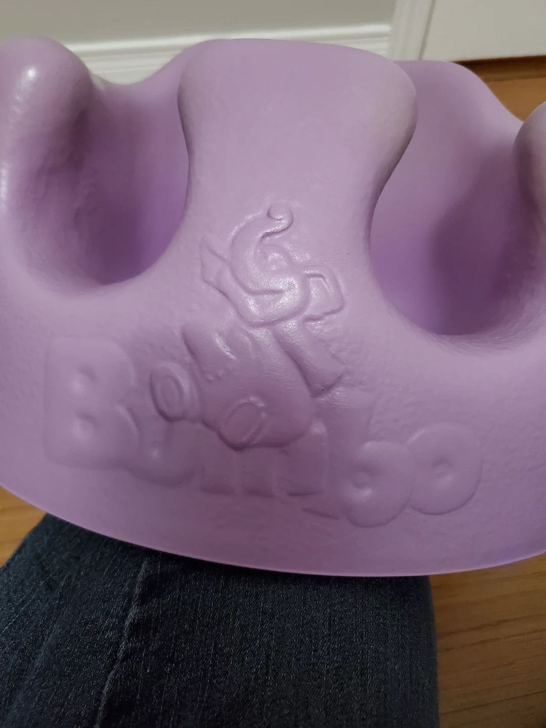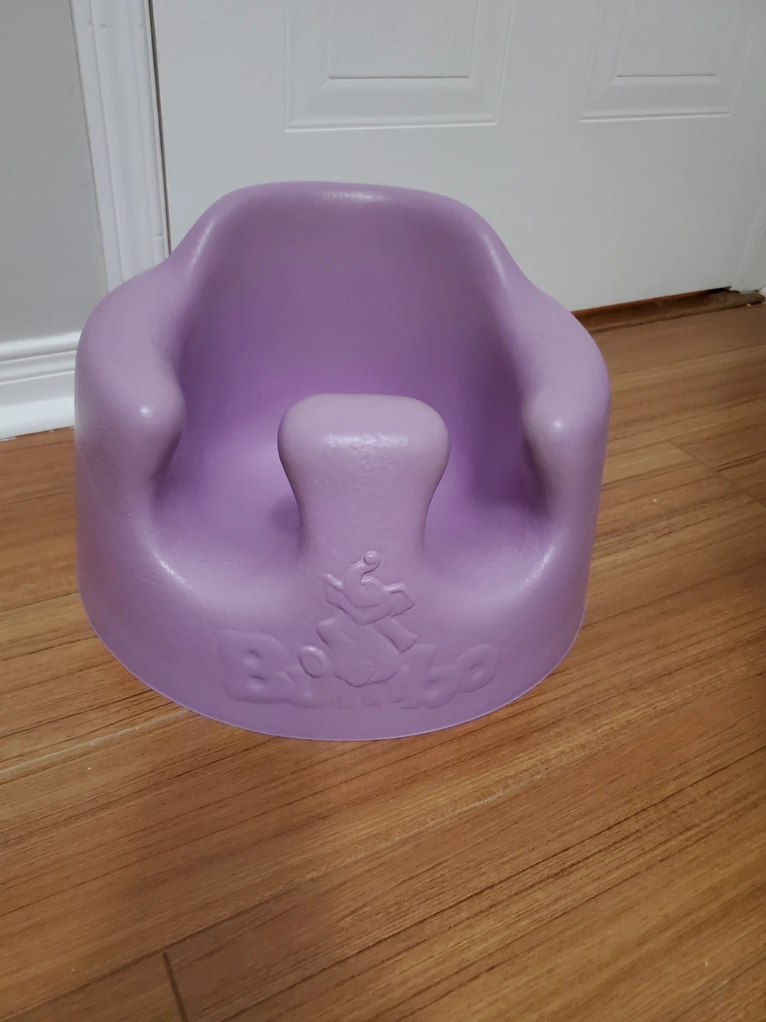 This is a Bumbo baby seat in a light purple colour. It's made from a durable foam material. This seat helps support infants learning to sit up. It's designed for babies 3 to 12 months.