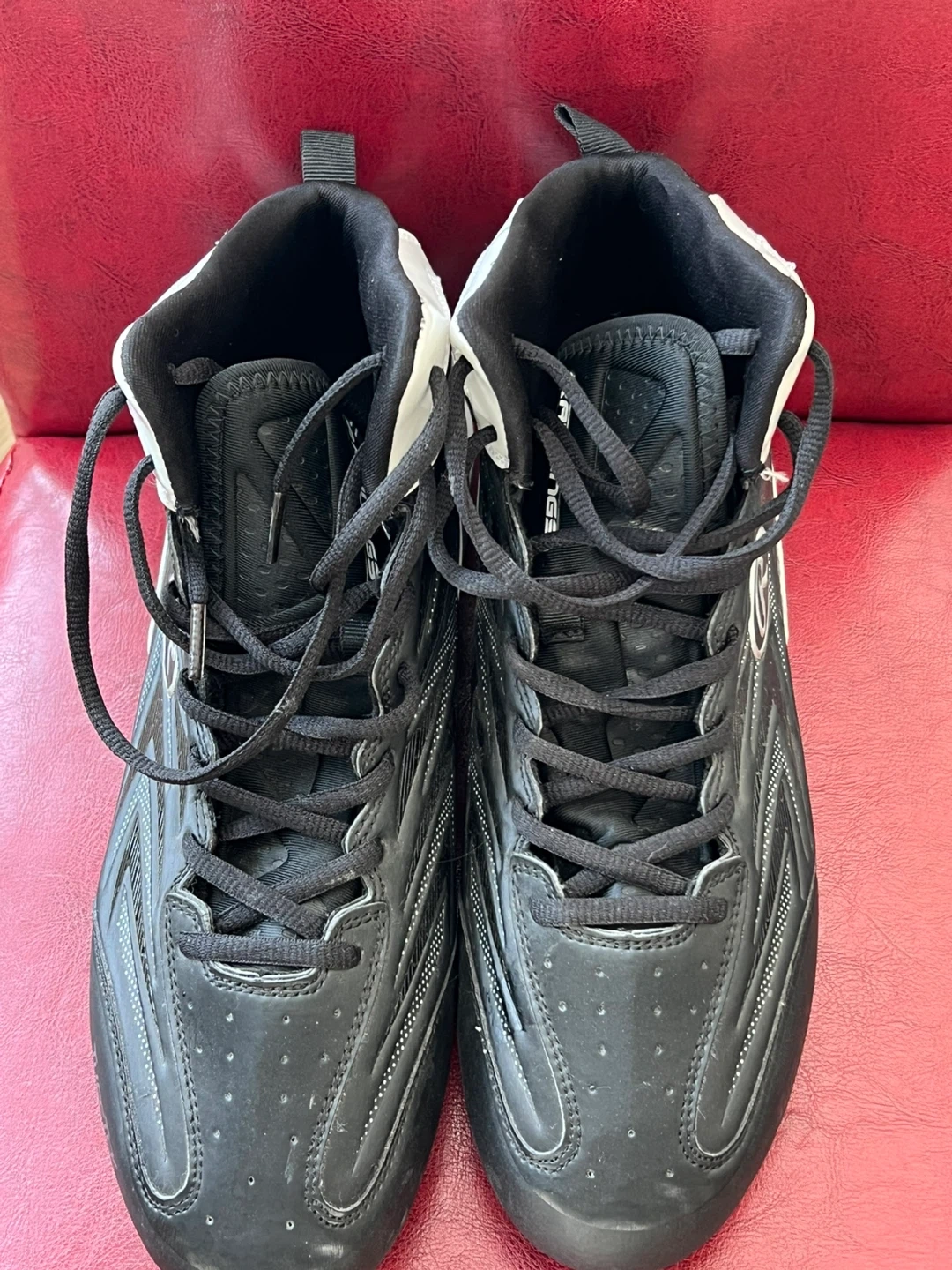 Rawlings Renegade Mid baseball cleats in black and white. All man-made materials. US size 11. Made in China. These cleats are built for the ball diamond!