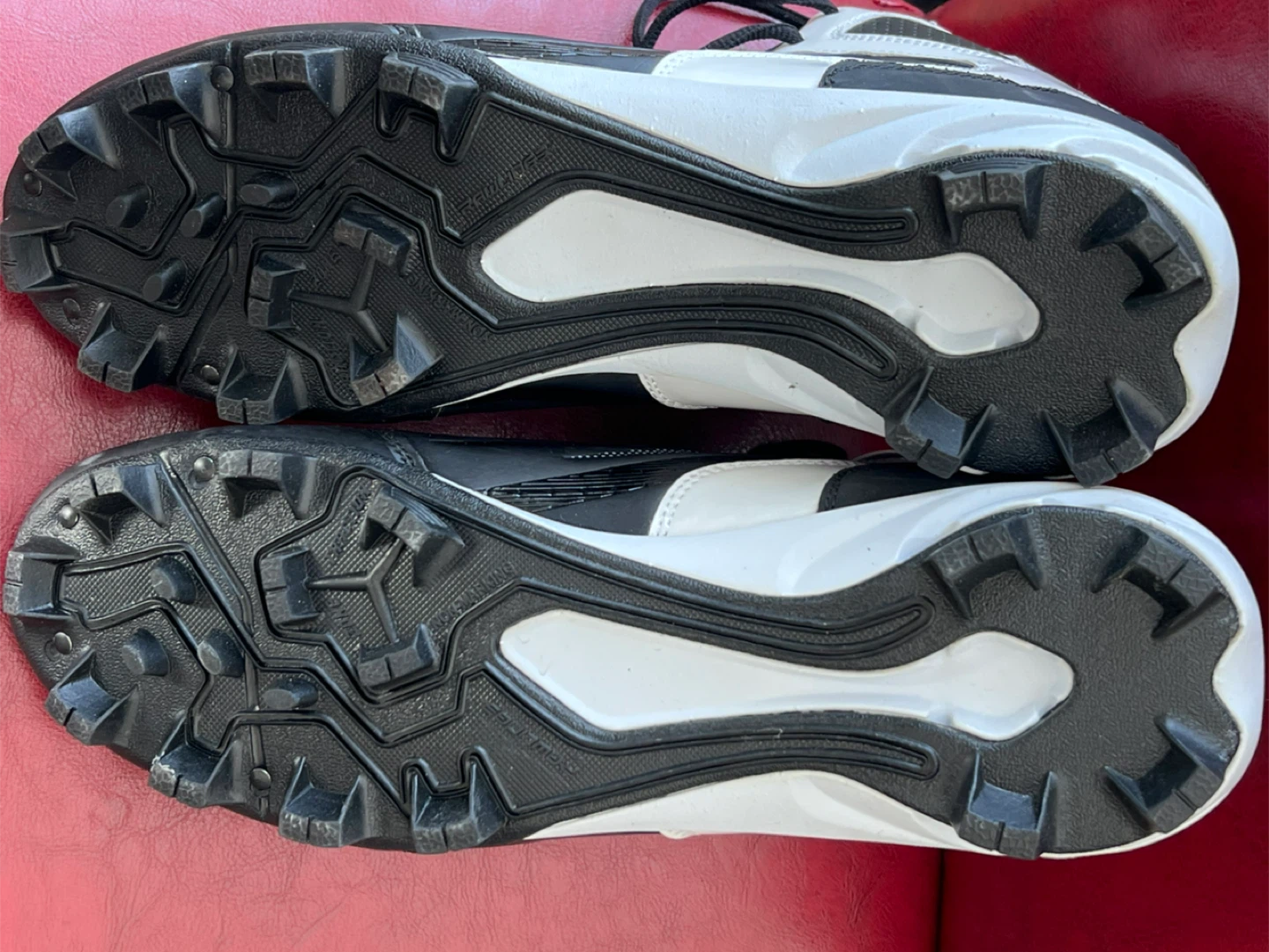 Rawlings Renegade Mid baseball cleats in black and white. All man-made materials. US size 11. Made in China. These cleats are built for the ball diamond!