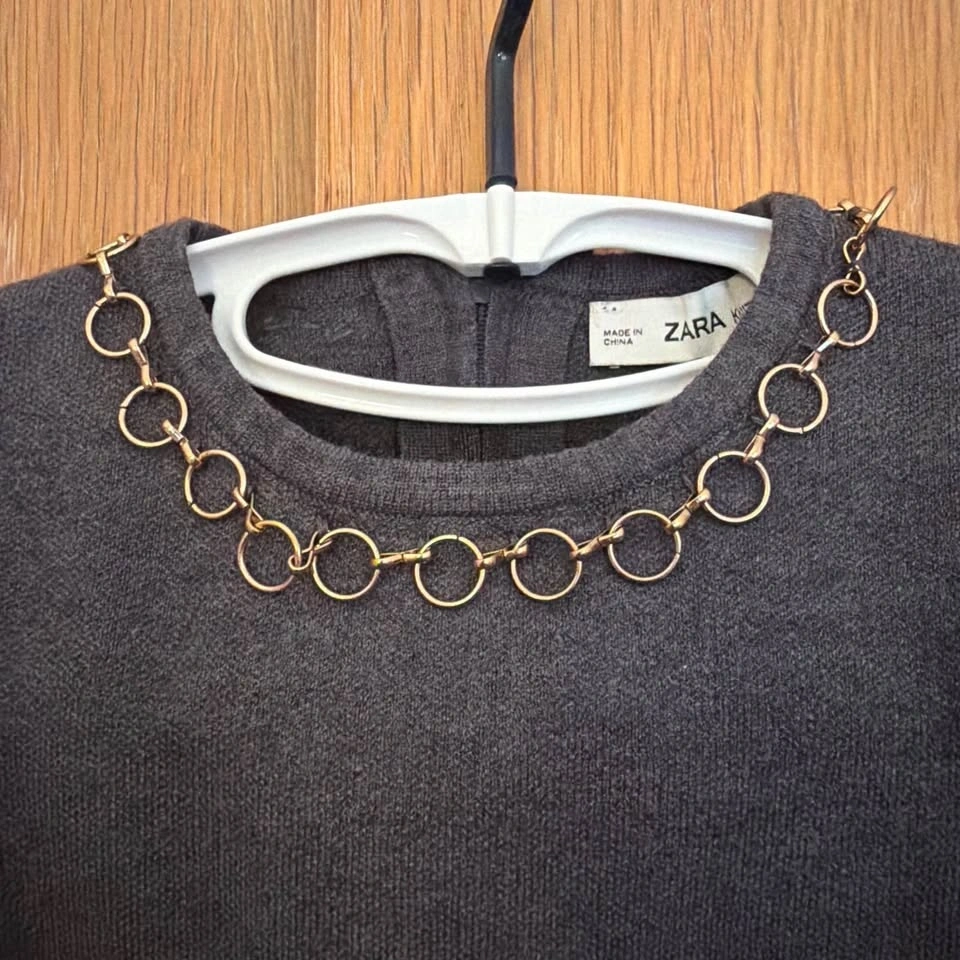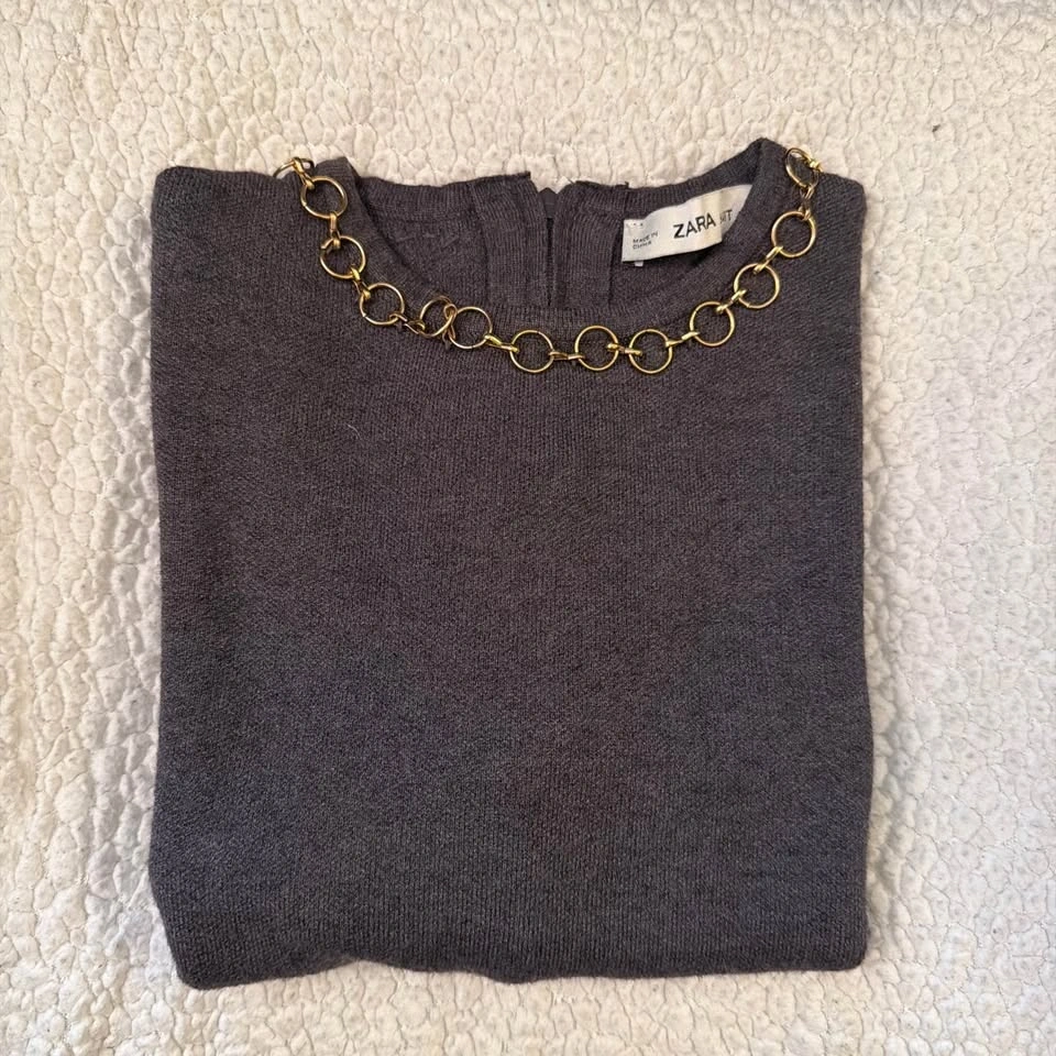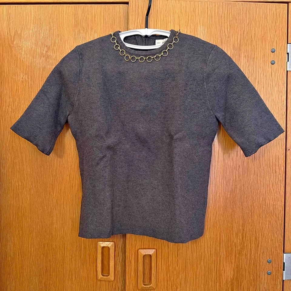 Charcoal gray short-sleeve top from Zara. Features a decorative gold-tone circular chain at the neckline. Simple, polished design for layering or standalone wear.