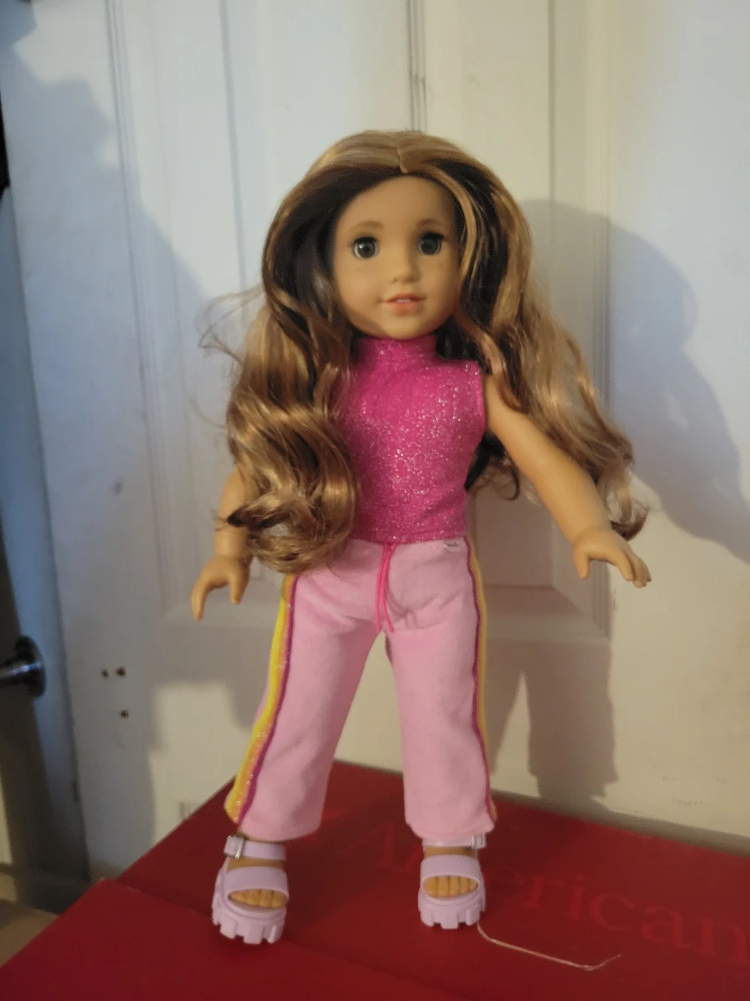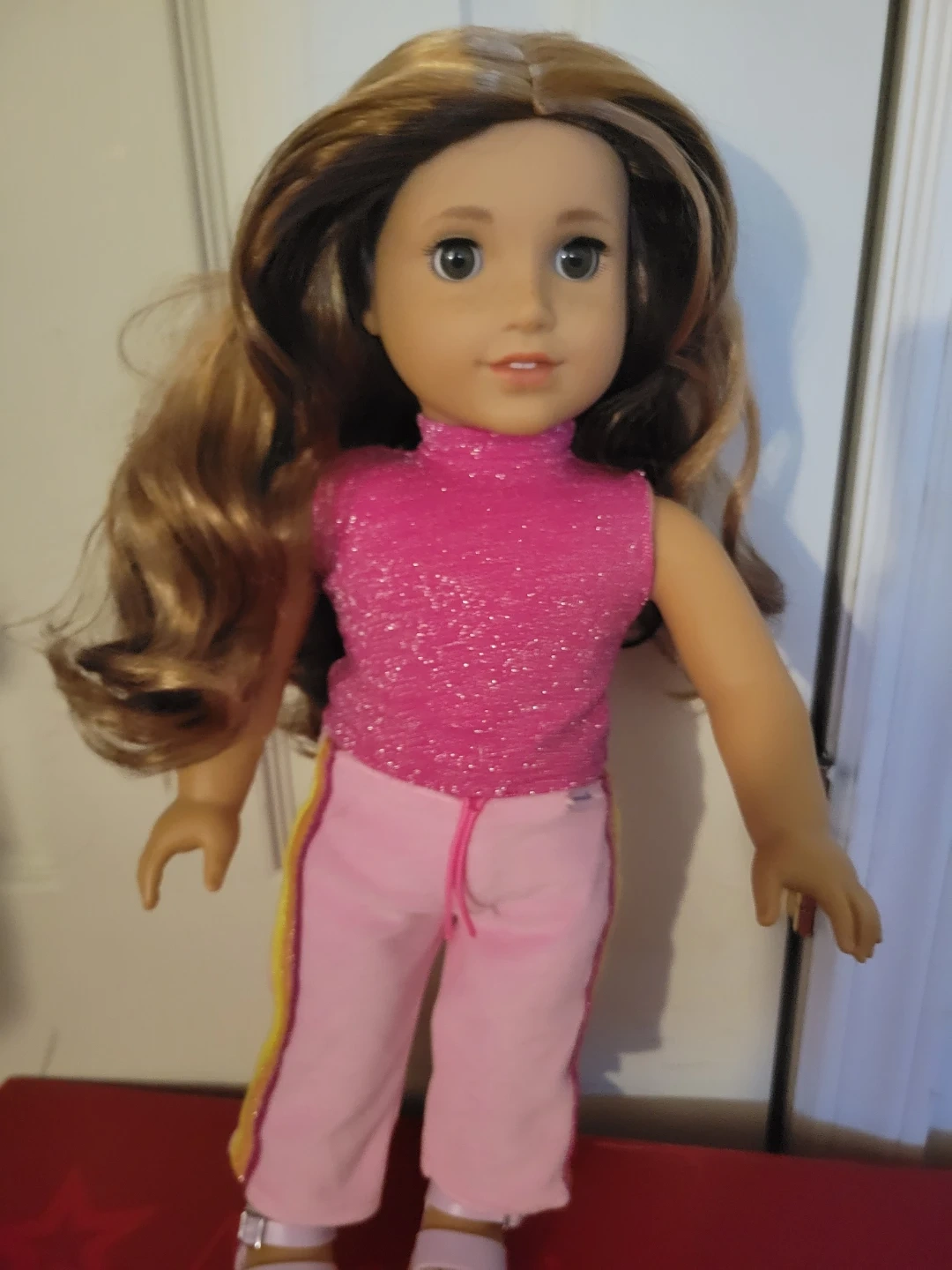 This American Girl doll has long, wavy brown hair and freckles. She's wearing a sparkly pink top and pink velour pants with yellow stripes. She also has on pink platform sandals. It's a fun outfit!