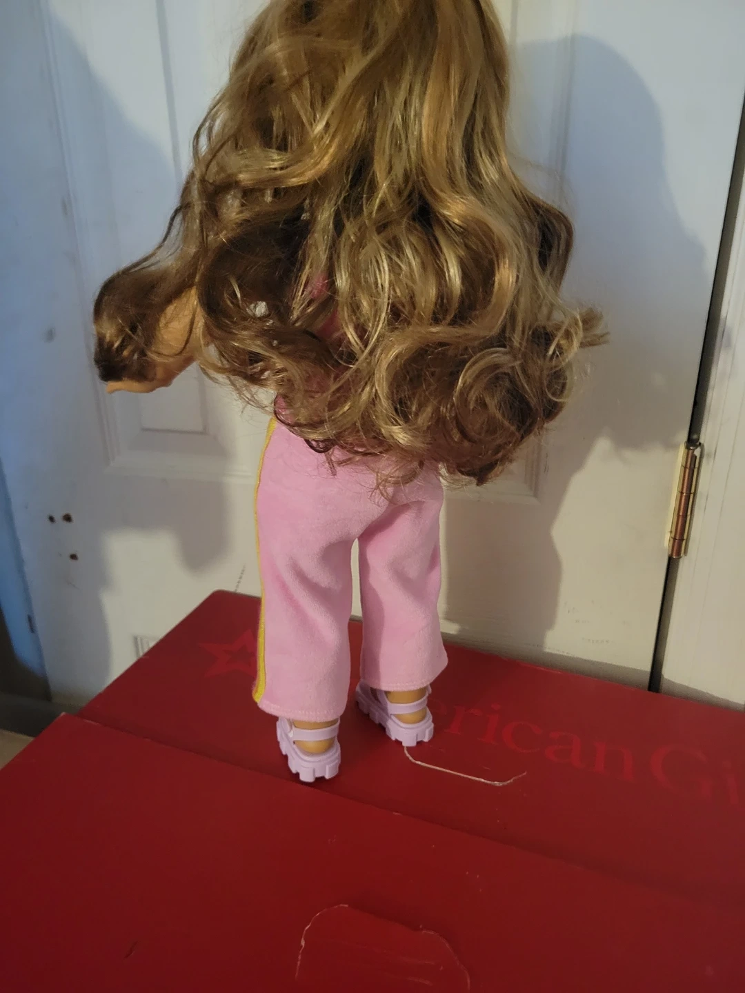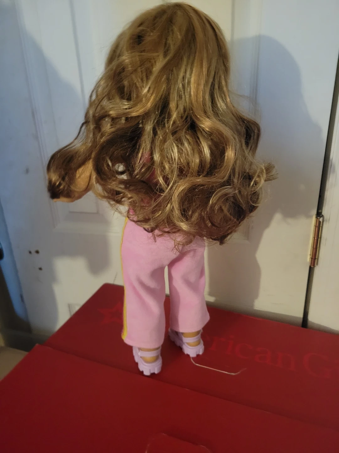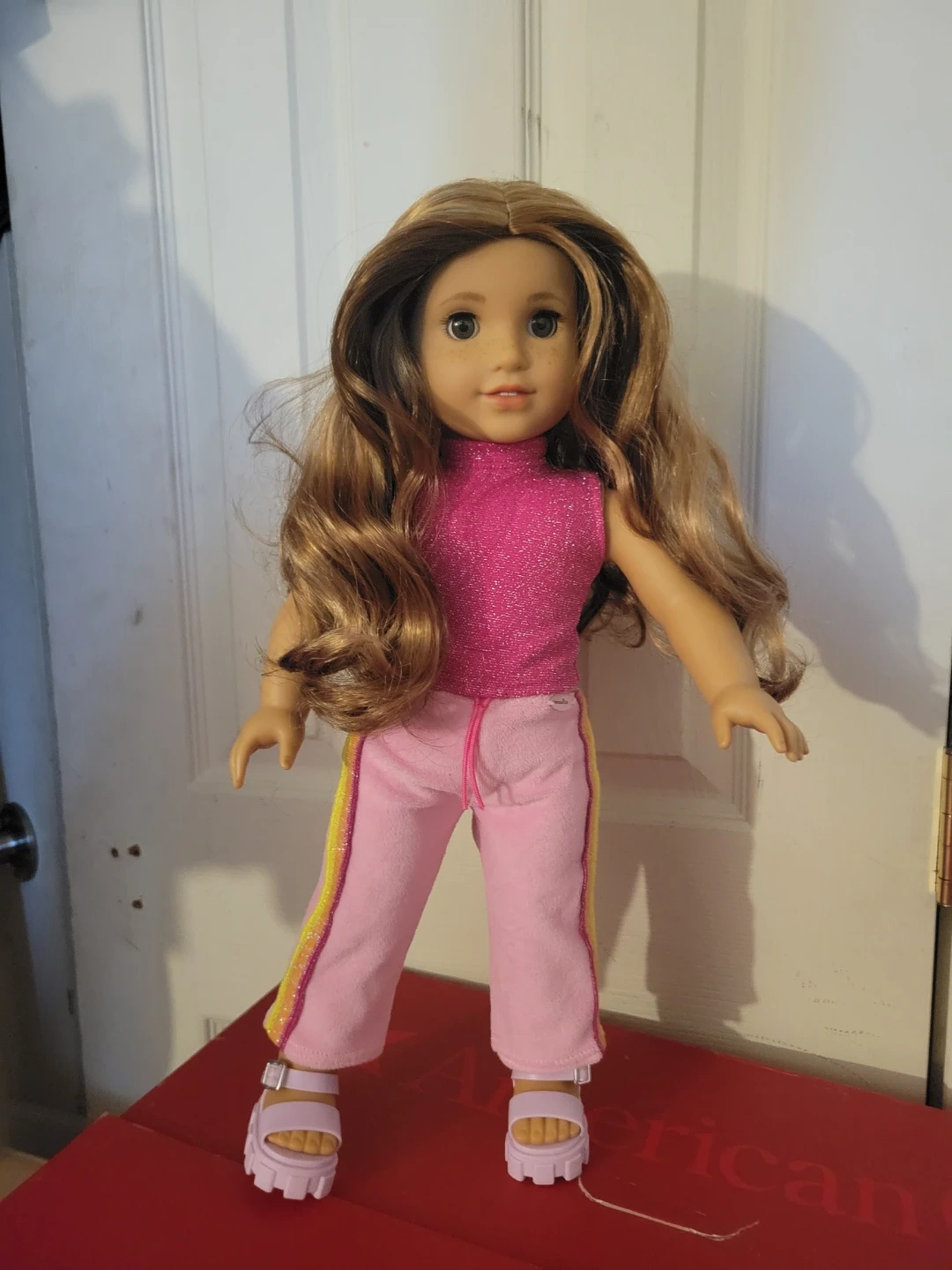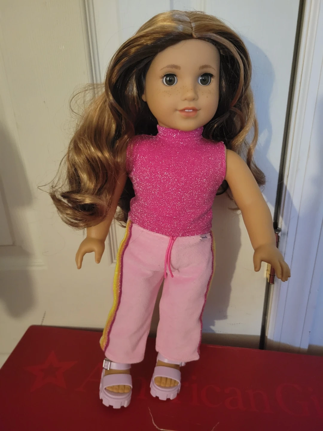This American Girl doll has long, wavy brown hair and freckles. She's wearing a sparkly pink top and pink velour pants with yellow stripes. She also has on pink platform sandals. It's a fun outfit!