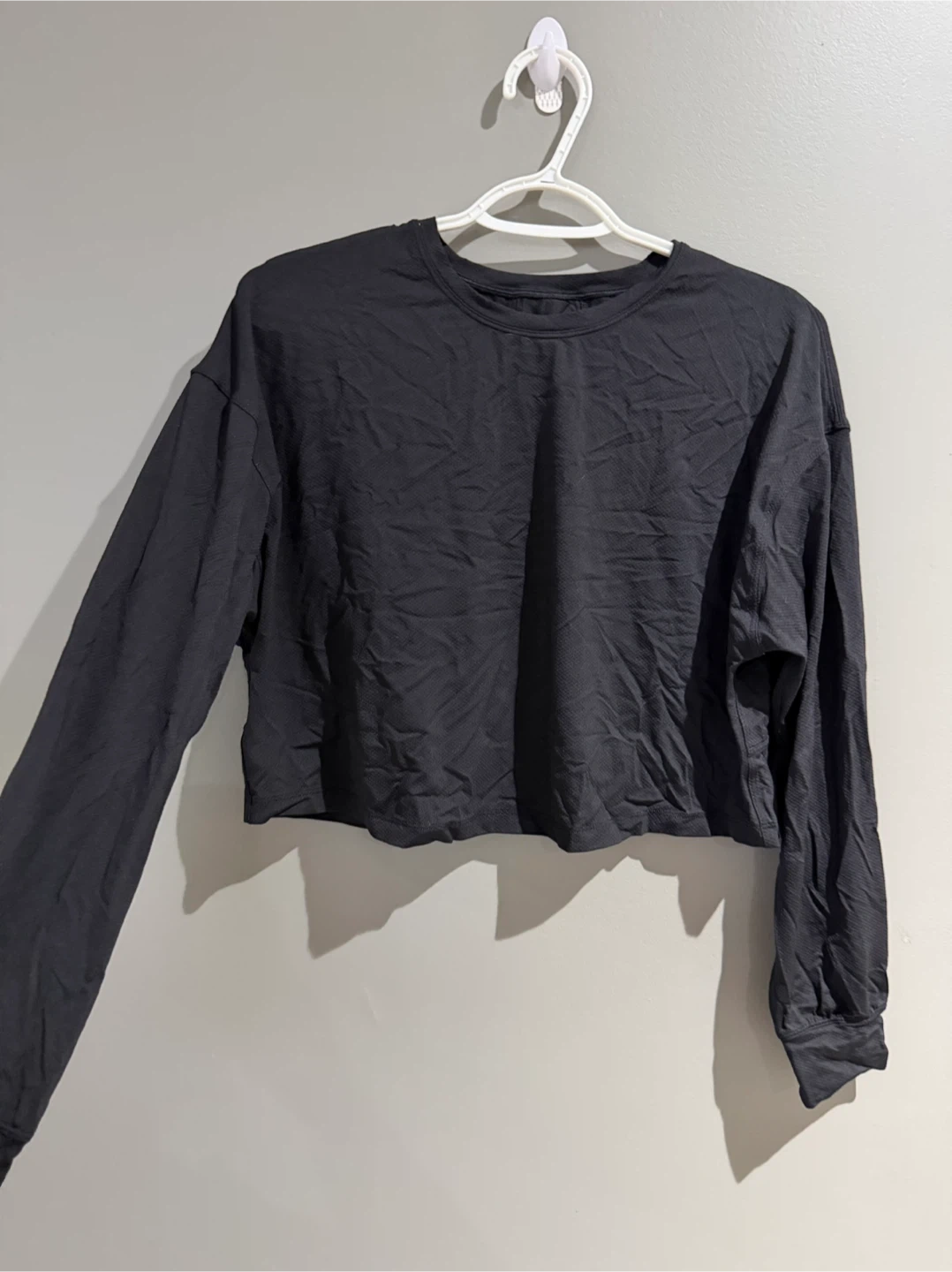 This is a black cropped long sleeve shirt. It's made of a lightweight, breathable fabric. Perfect for layering or wearing on its own!