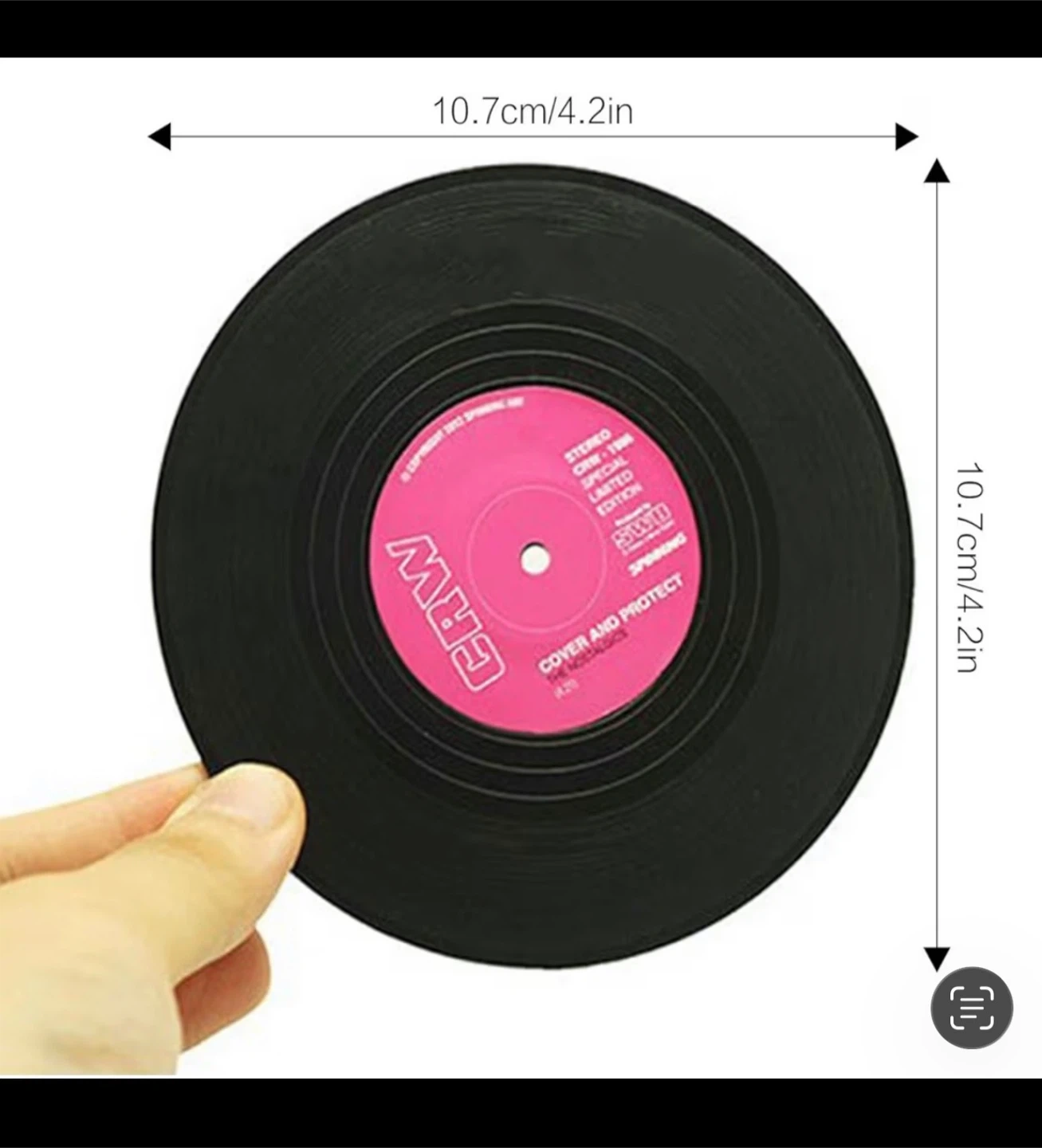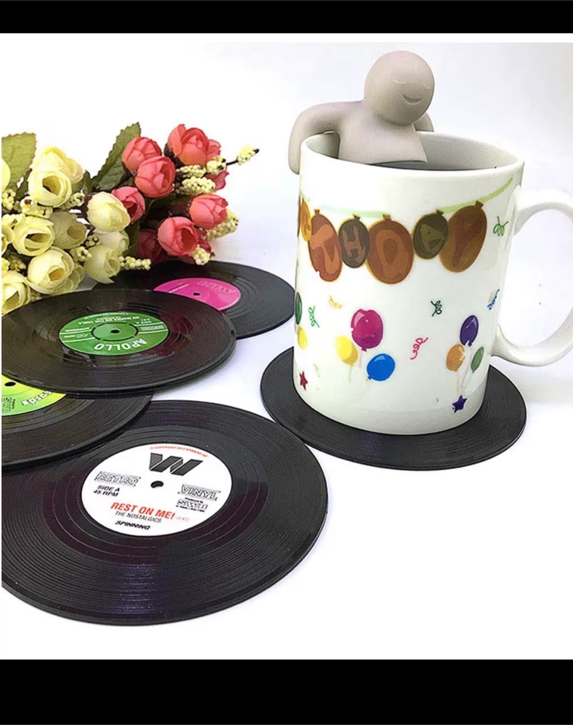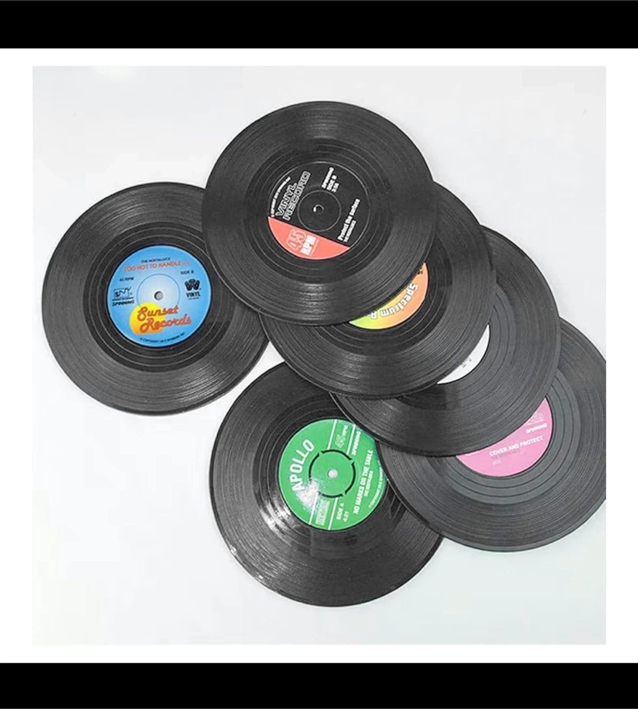 Brand new in box mini vinyl record coasters. These coasters are perfect for your drink, beer, tea, whiskey, vodka or soda. Diameter of 10.5 cm and thickness of 0.2 cm. The non-slip design ensures that your glasses and mugs do not slide. Ideal gift for music lovers. Set of 6 multi-colored vinyl record coasters.