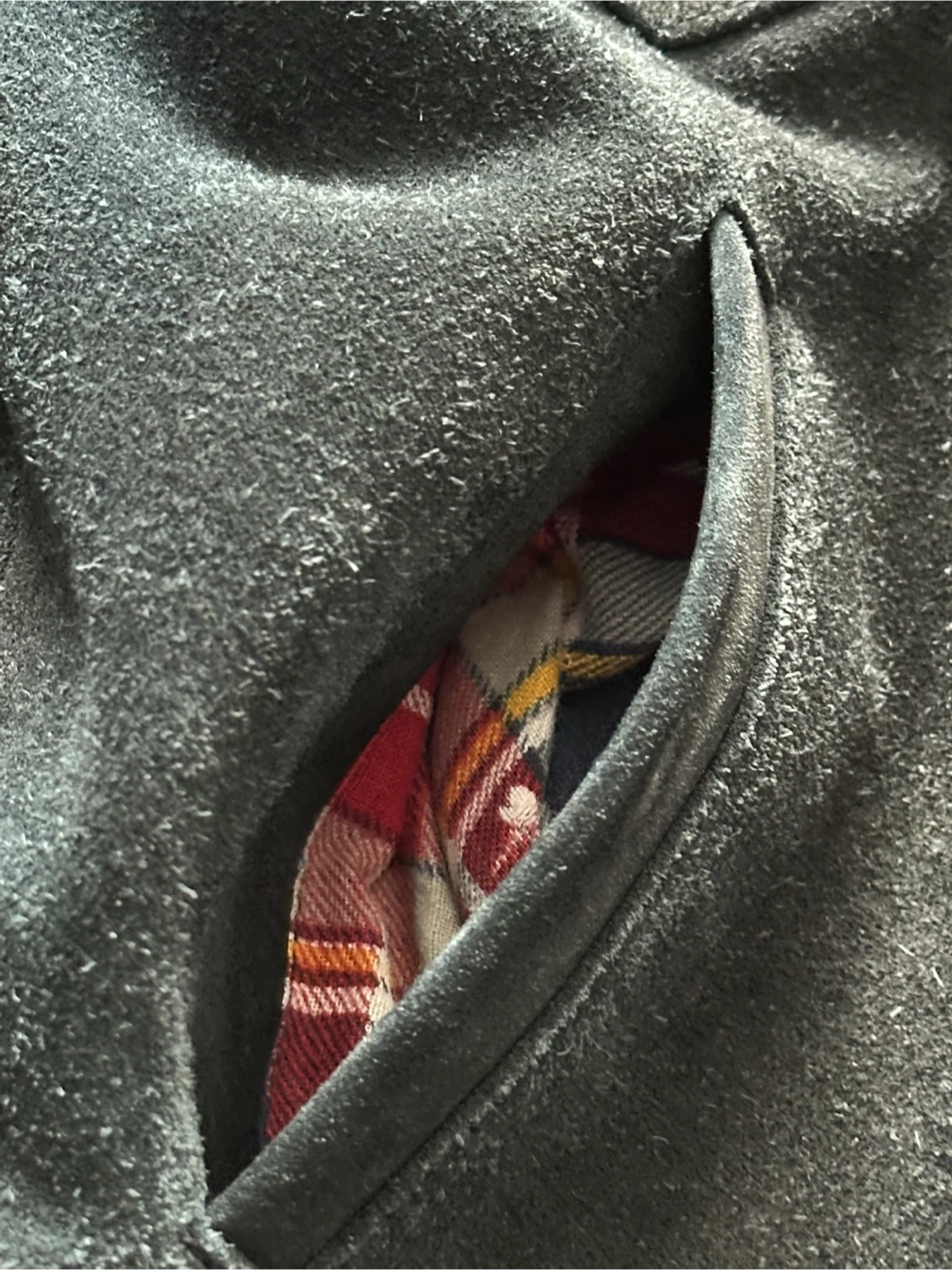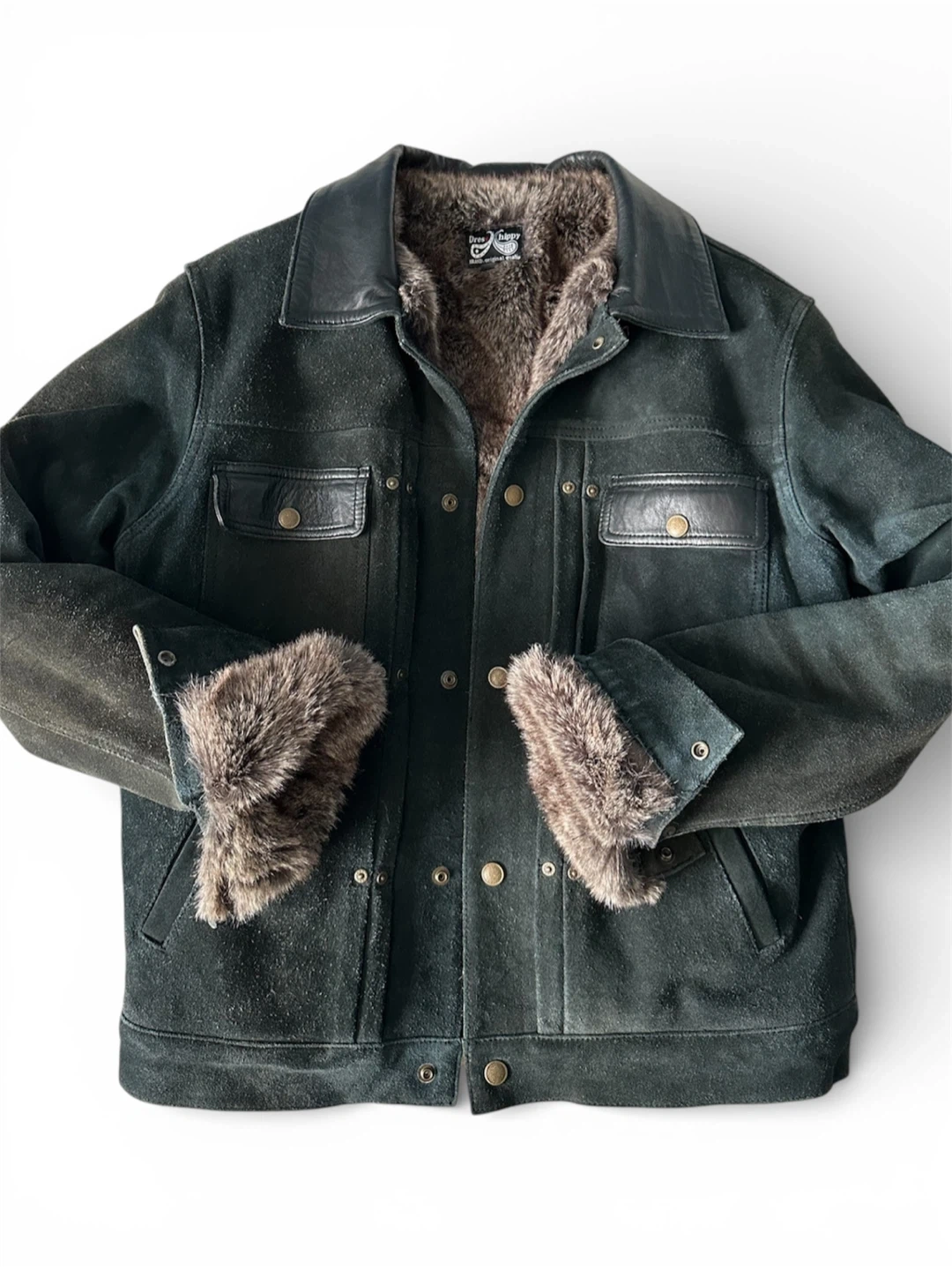 This Dream Denim jacket features a rich green suede exterior with a cozy faux fur lining. It has a classic trucker jacket design with button closures, 2 chest pockets and 2 hand warmer pockets that are also lined for extra warmth. Suede material outer and very dense and warm fur lining. Perfect for winter season. Size small
