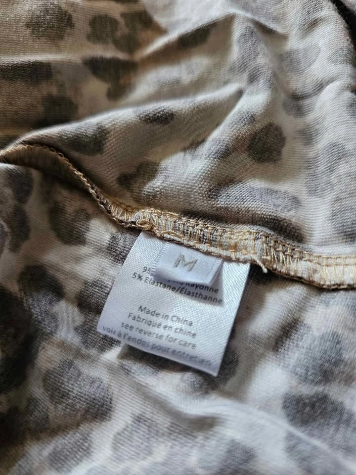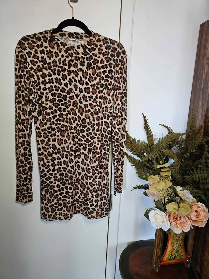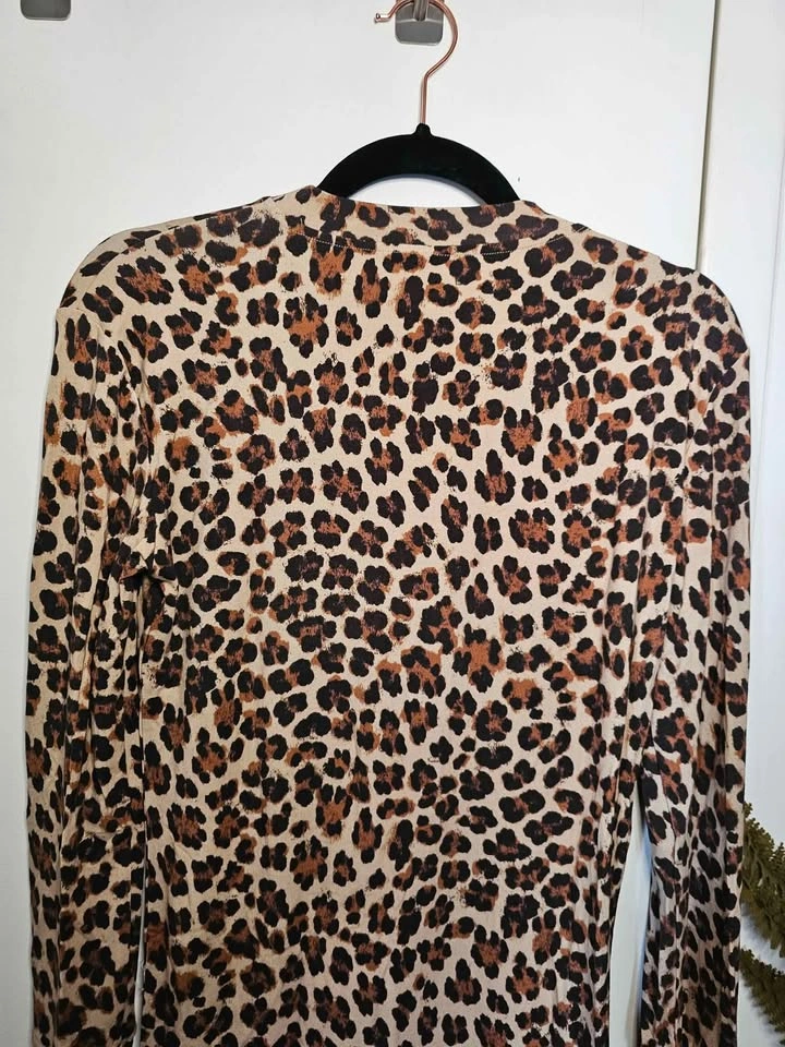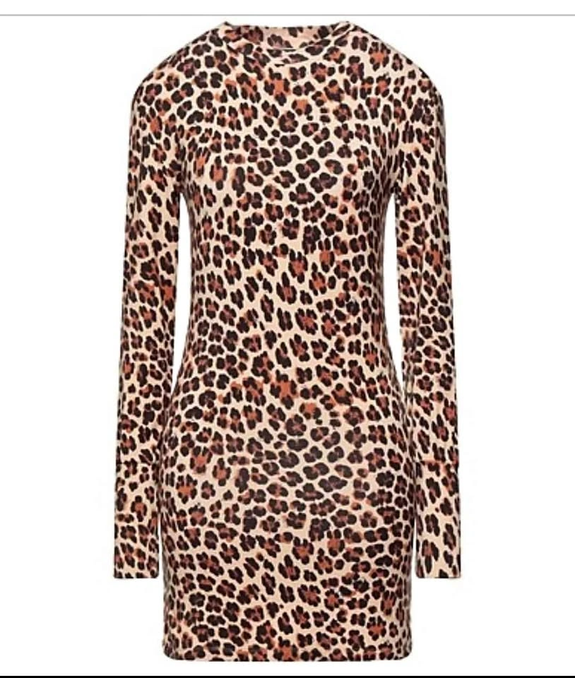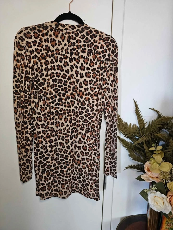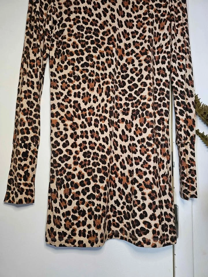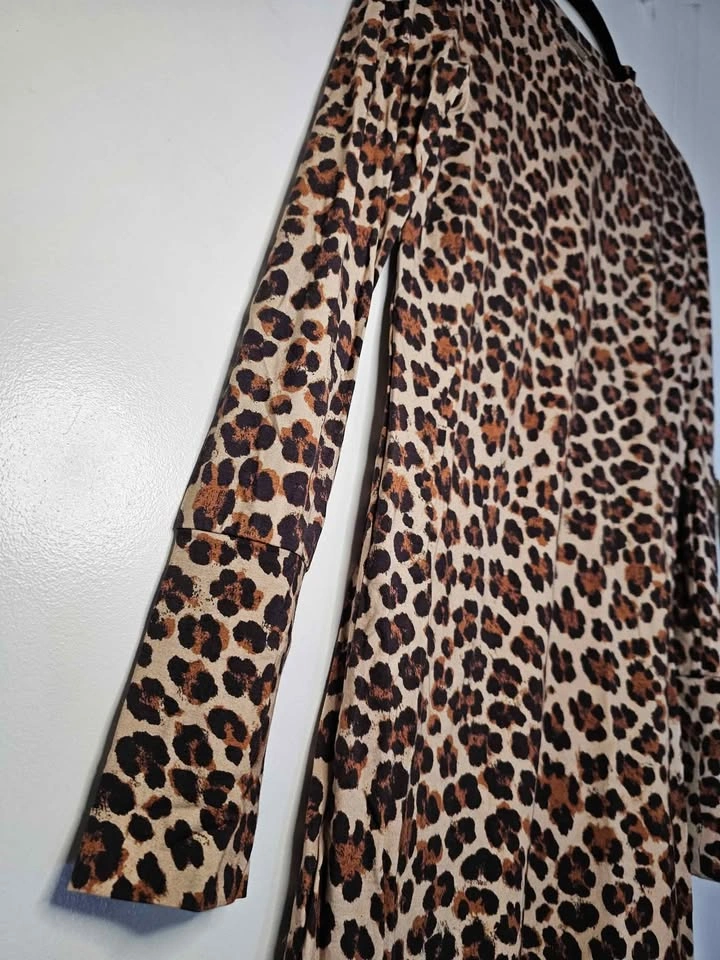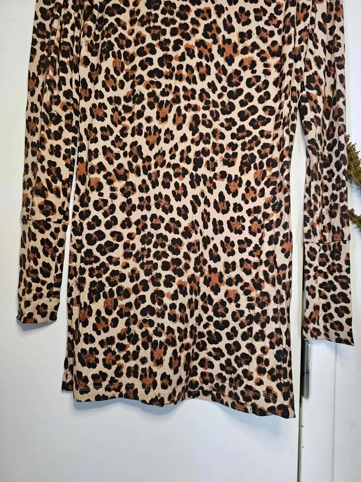 Stylish leopard print long sleeve tunic length top or party mini dress from reputable Mediterranean inspired designer Caroline Constas. Dress is leopard print and made of a soft, slinky and stretchy rayon/ elastane blend. It has a round neck and wide sleeve cuffs. Perfect for dressing down with leggings or dressing up for a night out with heels.