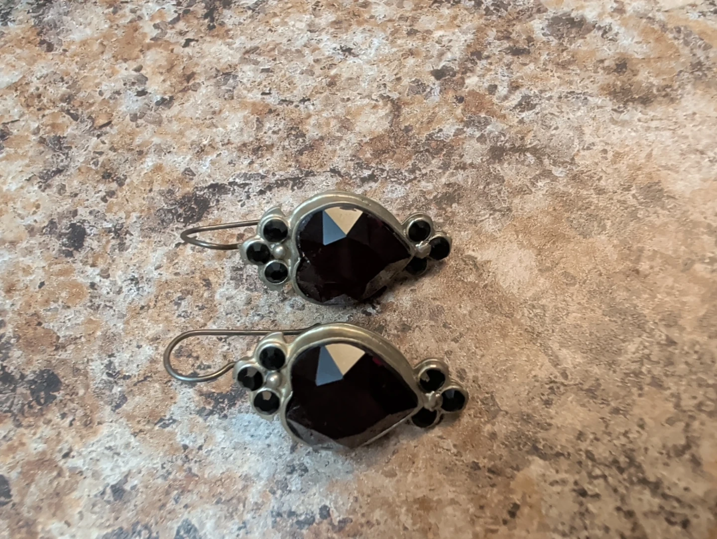 A pair of heart-shaped garnet earrings with small black accent stones. The metal appears to be silver-toned. These earrings would be a lovely addition to any jewellery collection.