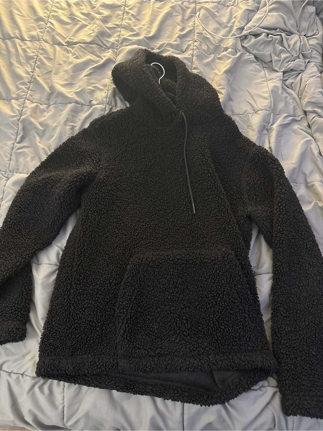 Cozy black teddy fleece hoodie with a front kangaroo pocket and adjustable drawstring hood. Material is soft and warm.
