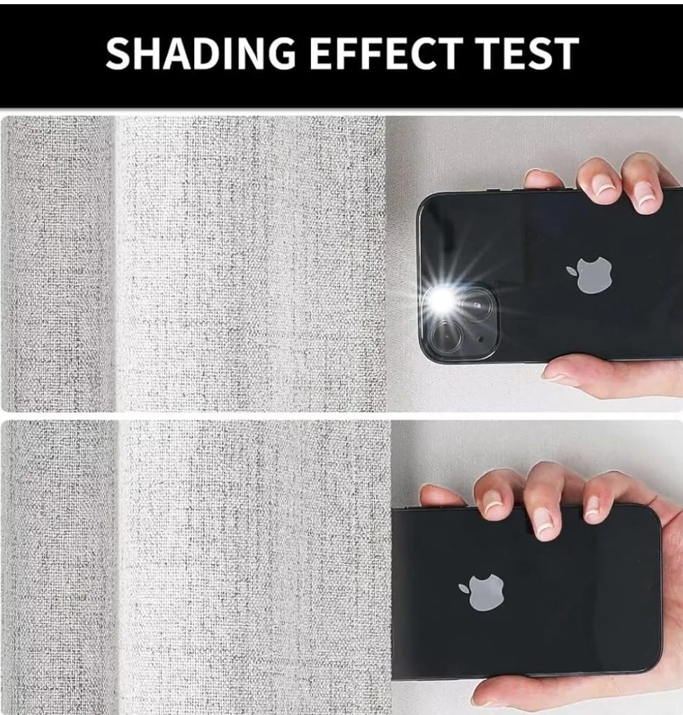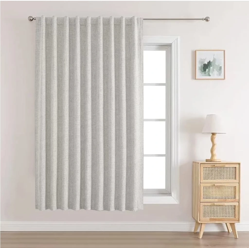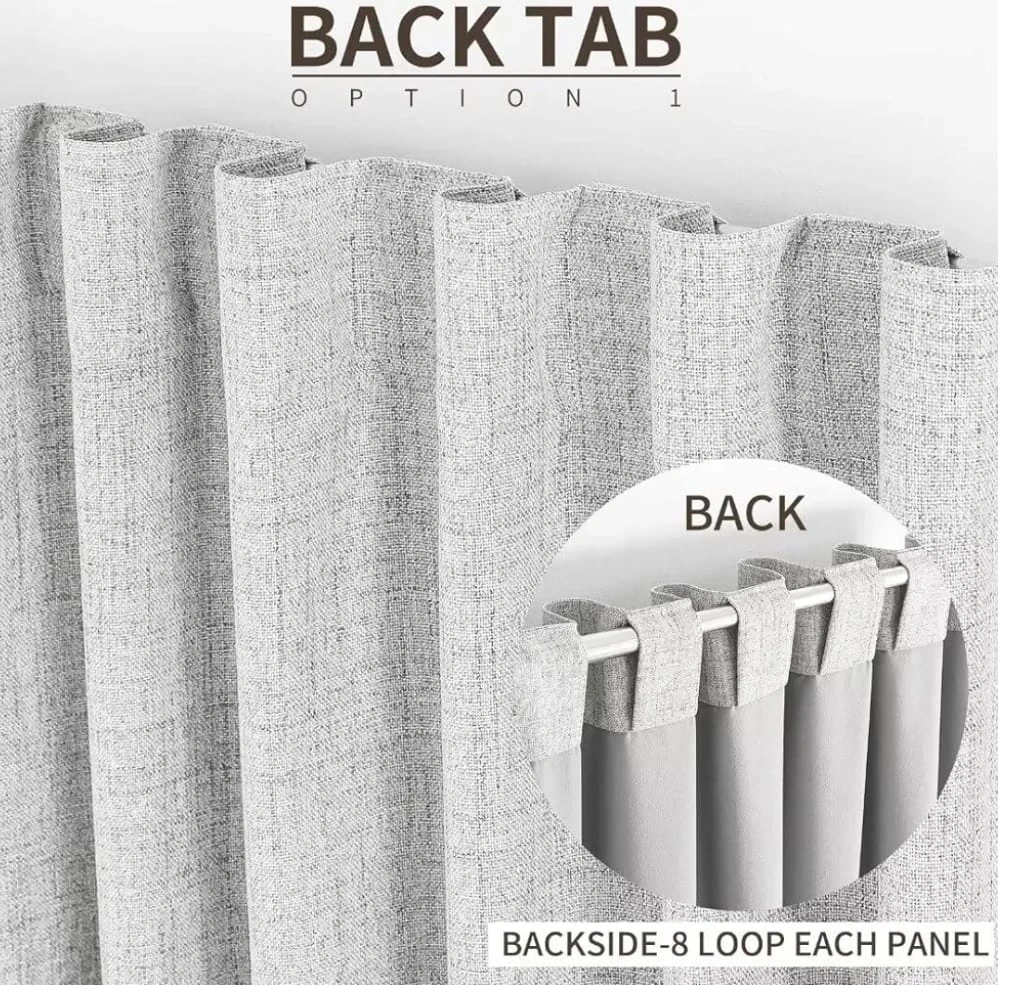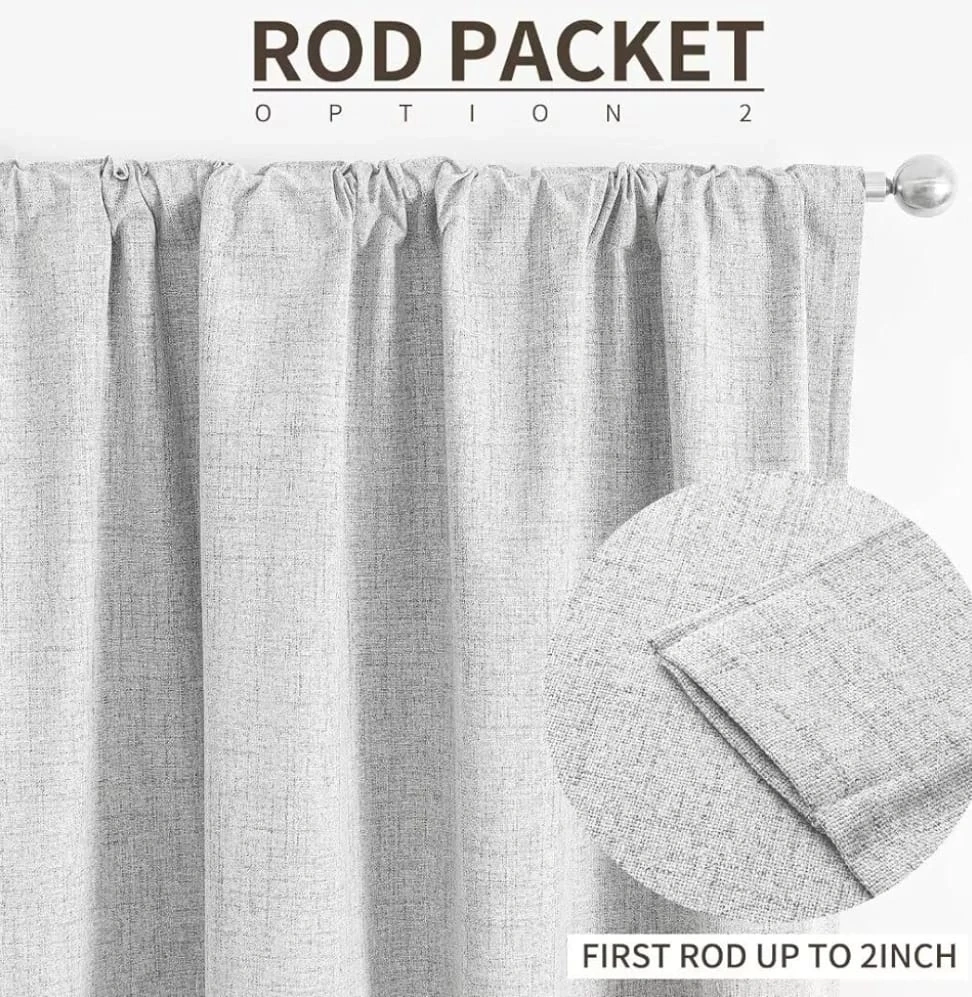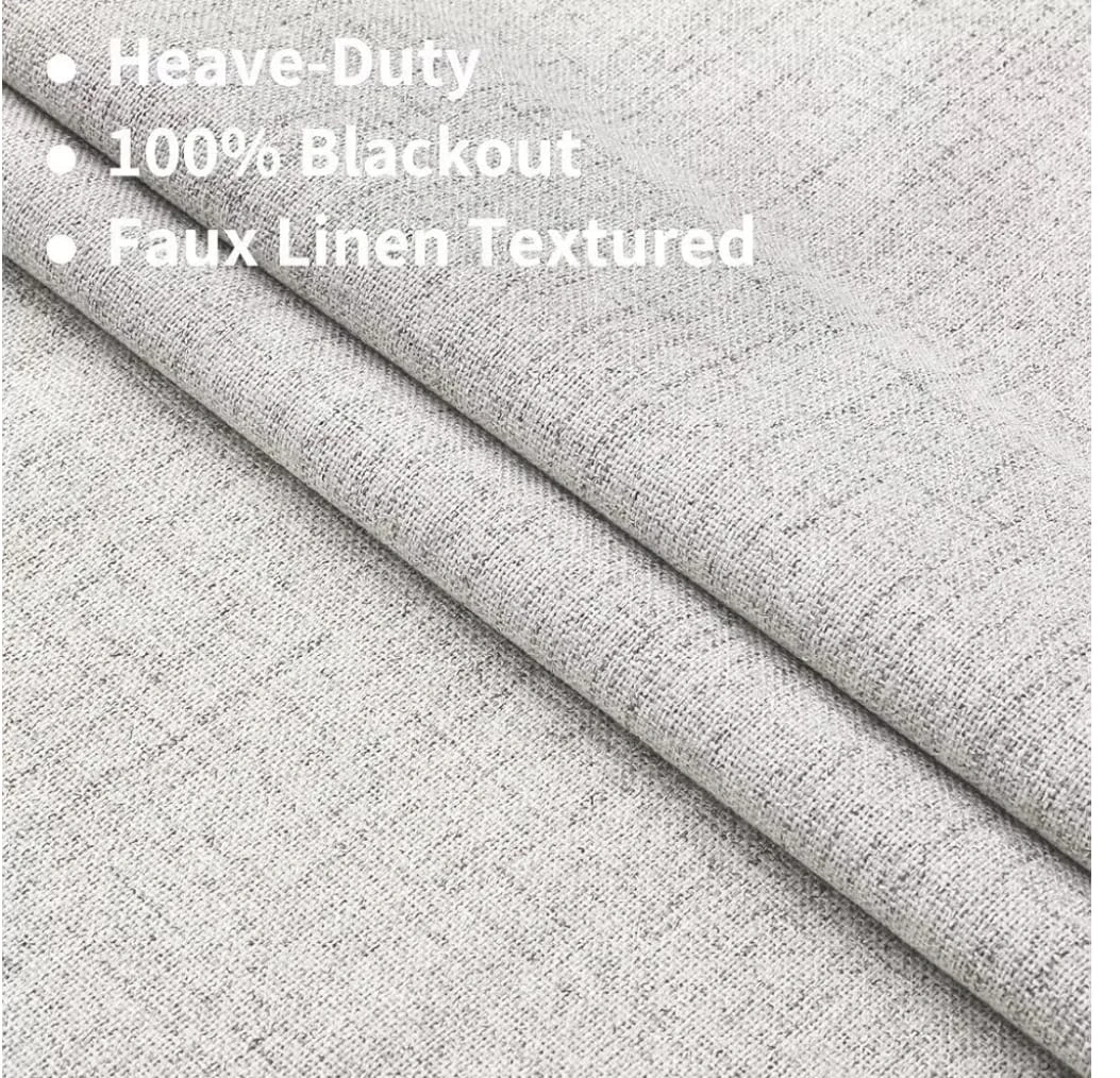 A window treatment with a faux linen texture. Designed with a rod pocket or back tab. Enjoy a peaceful sleep with these curtains. Features 100% blackout and heavy duty.