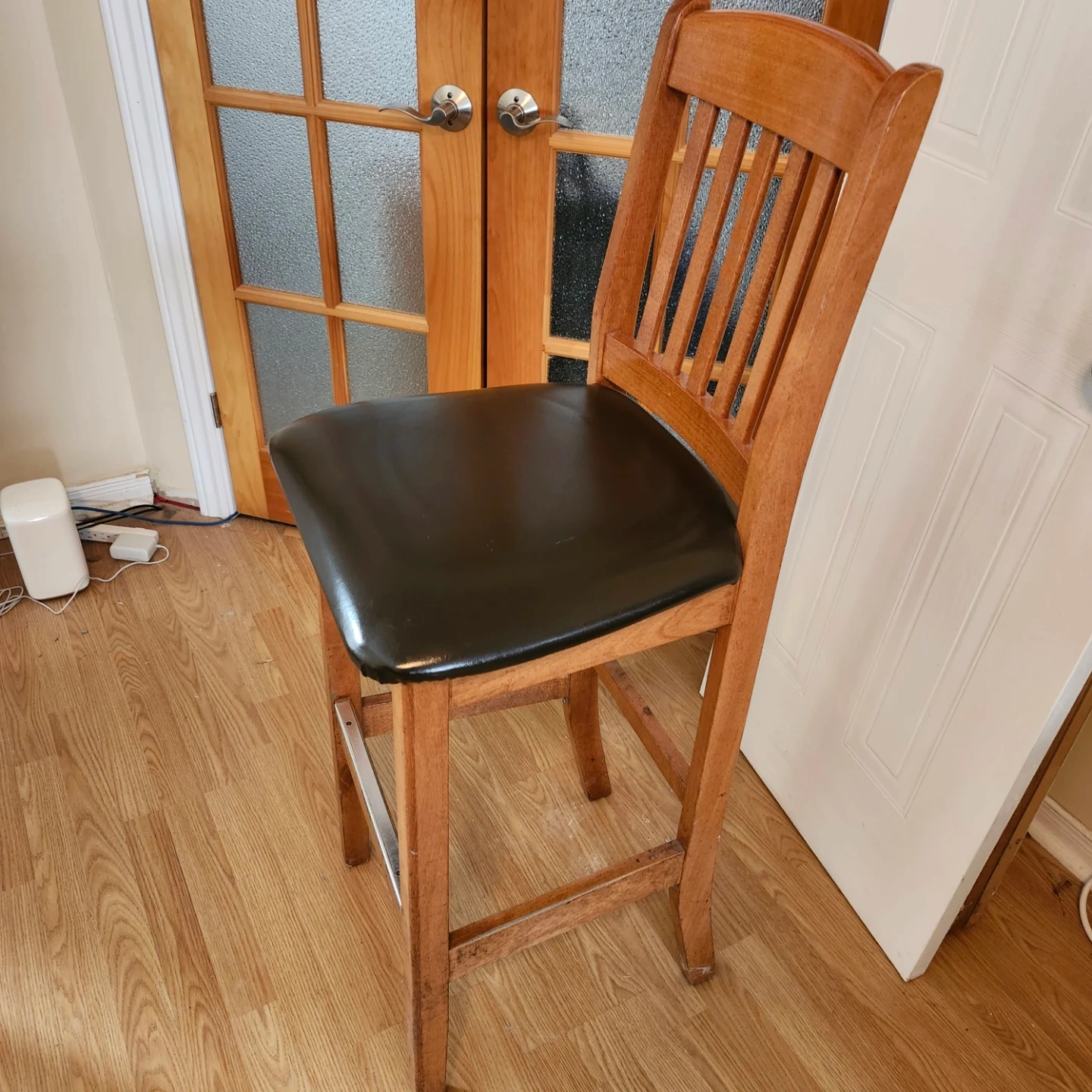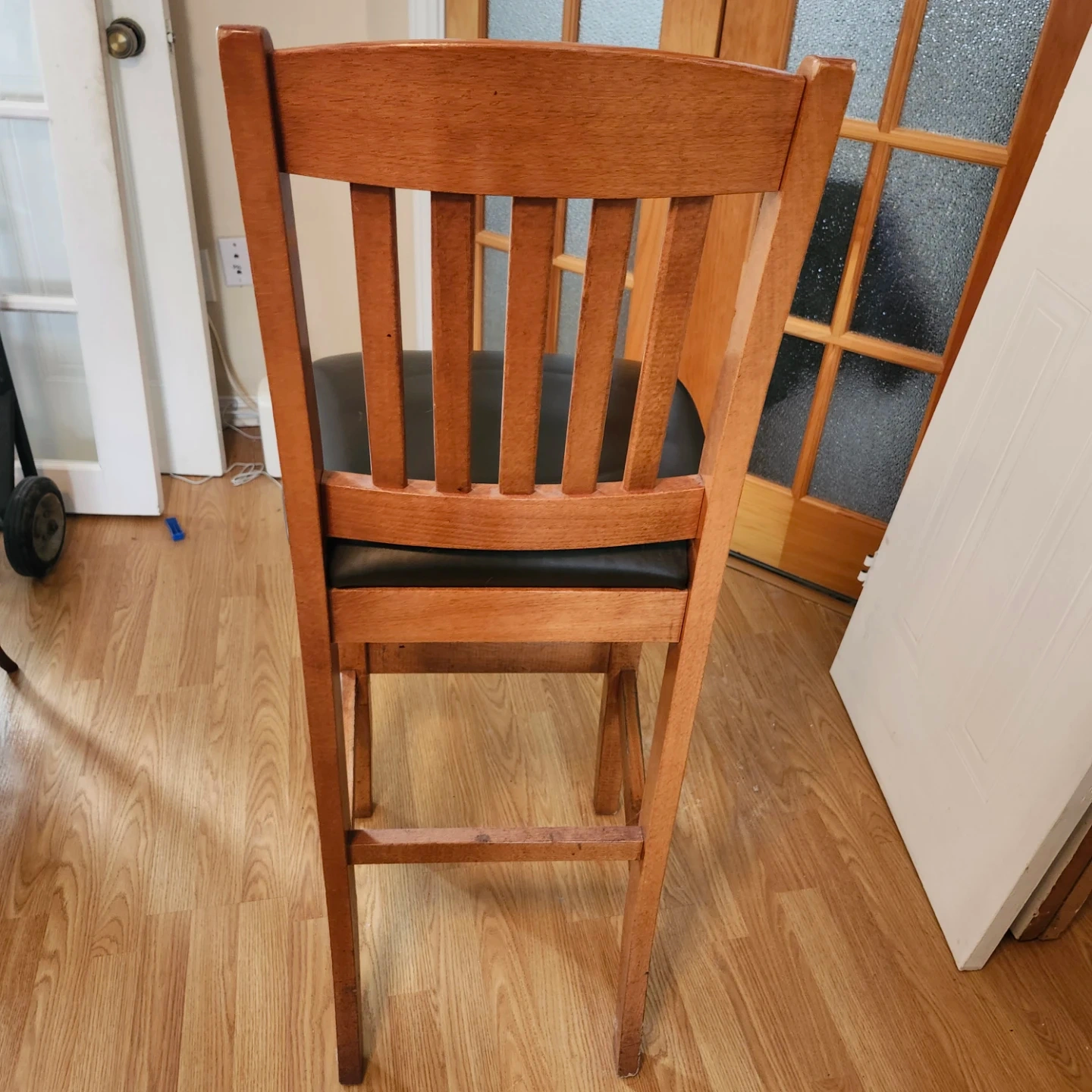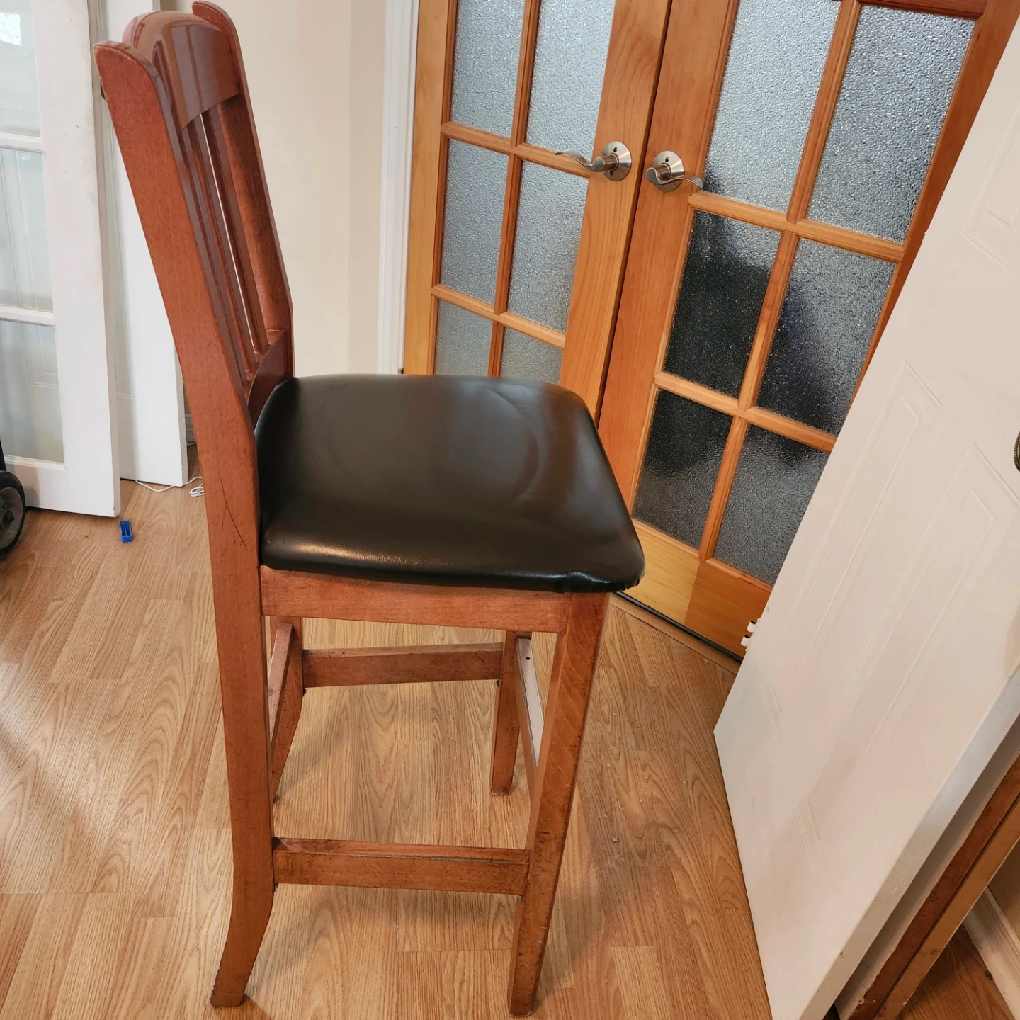 This is a sturdy wooden bar stool with a comfortable black padded seat. It's perfect for a kitchen island or home bar. The wooden frame offers a classic look.