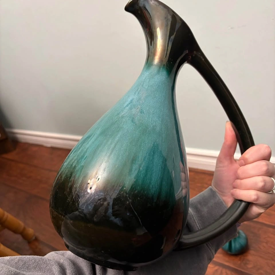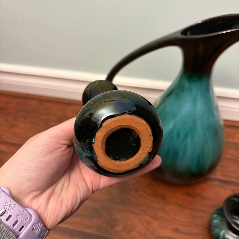 This is a set of vintage Canadian Blue Mountain Pottery in their iconic green and black drip glaze finish. The set includes a large pitcher with a long curved handle and two smaller matching vases or candle holders. Blue Mountain Pottery was produced in Ontario, Canada, from the 1960s until 2005. It is a collectible example of mid-century modern ceramic art.
